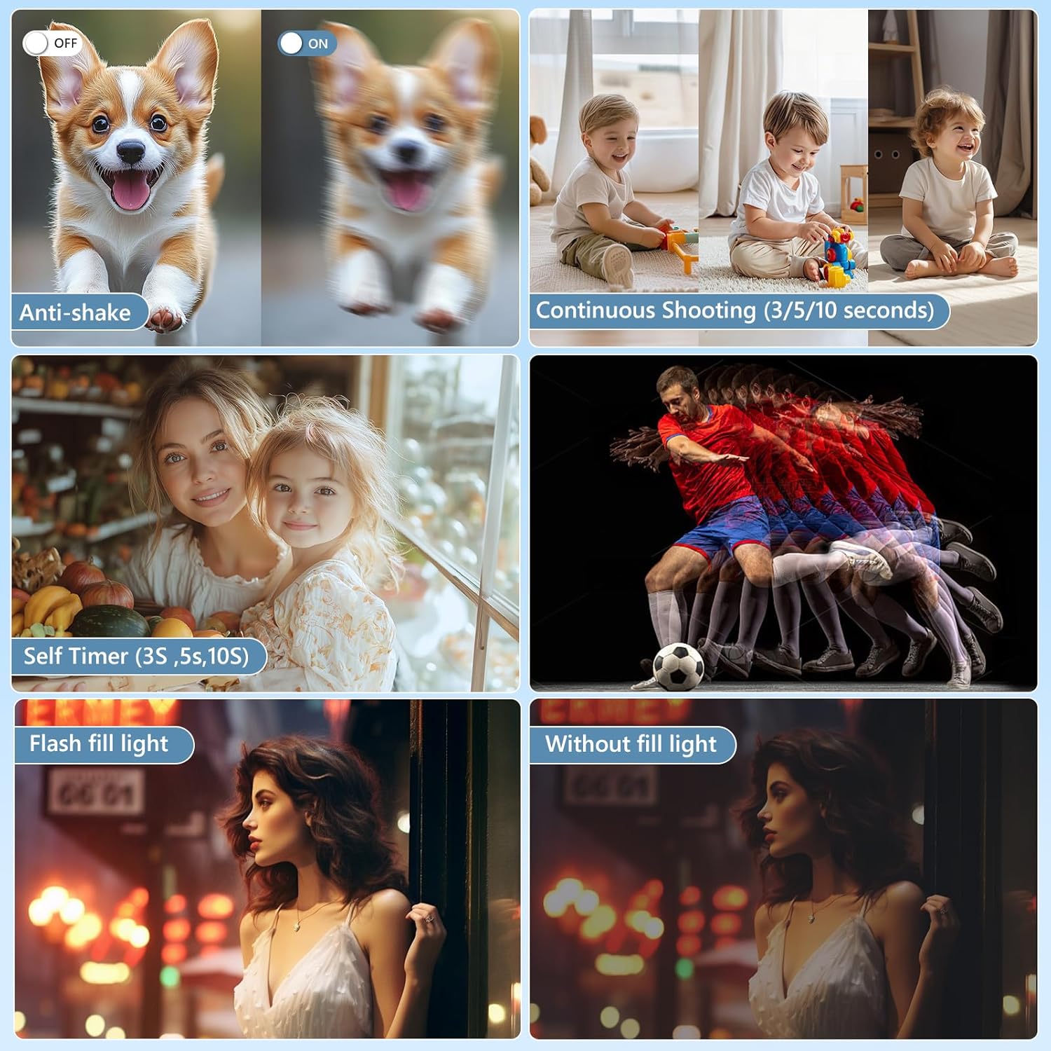 • Интелигентна система за автоматично фокусиране: цифровата система за детски фотоапарати използва хибридна технология за автоматично фокусиране (фазово откриване + измерване на контраста) за ултрабързо фокусиране за 0,03 секунди. В комбинация с разпознаване на лице/очи, тя гарантира резки обекти в портрети, снимки на животни или спортни сцени. Опростява записването на динамични моменти, като например играещи деца или движещи се домашни любимци.