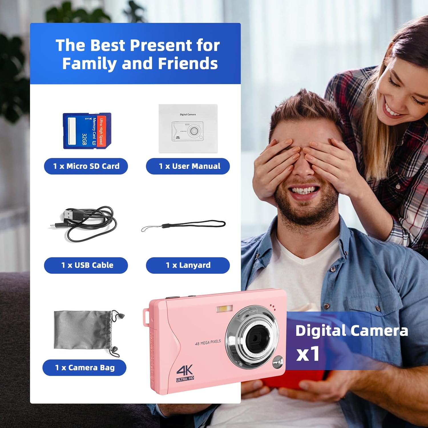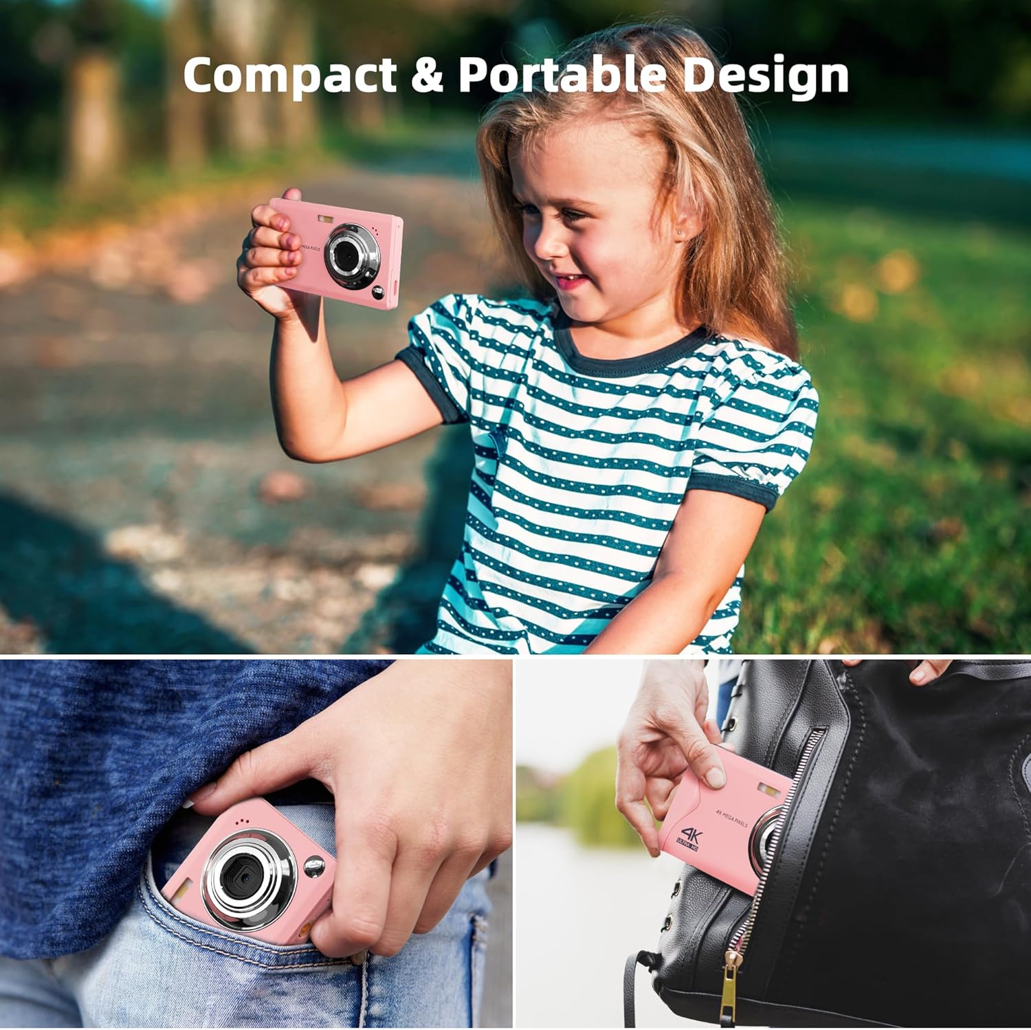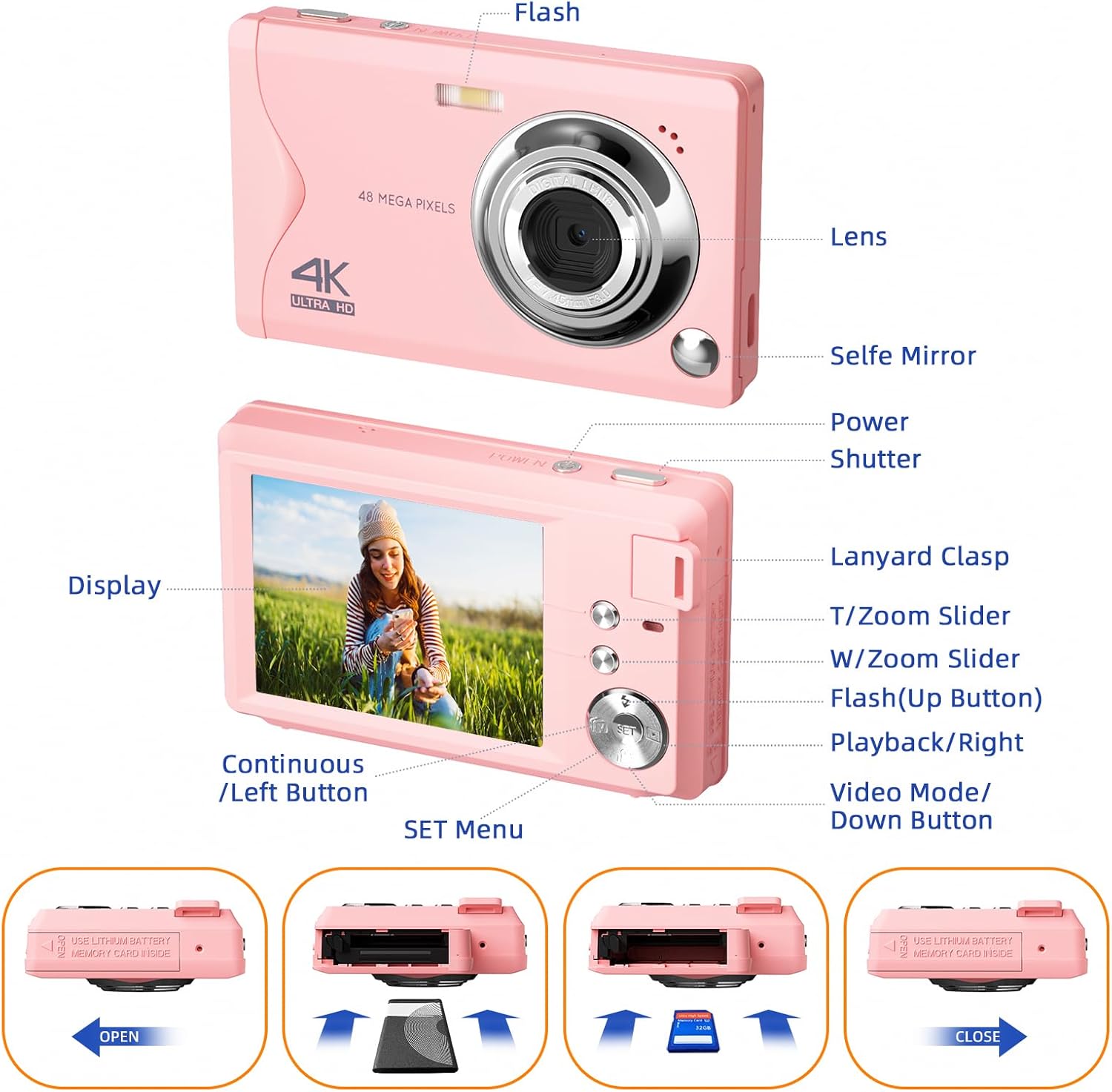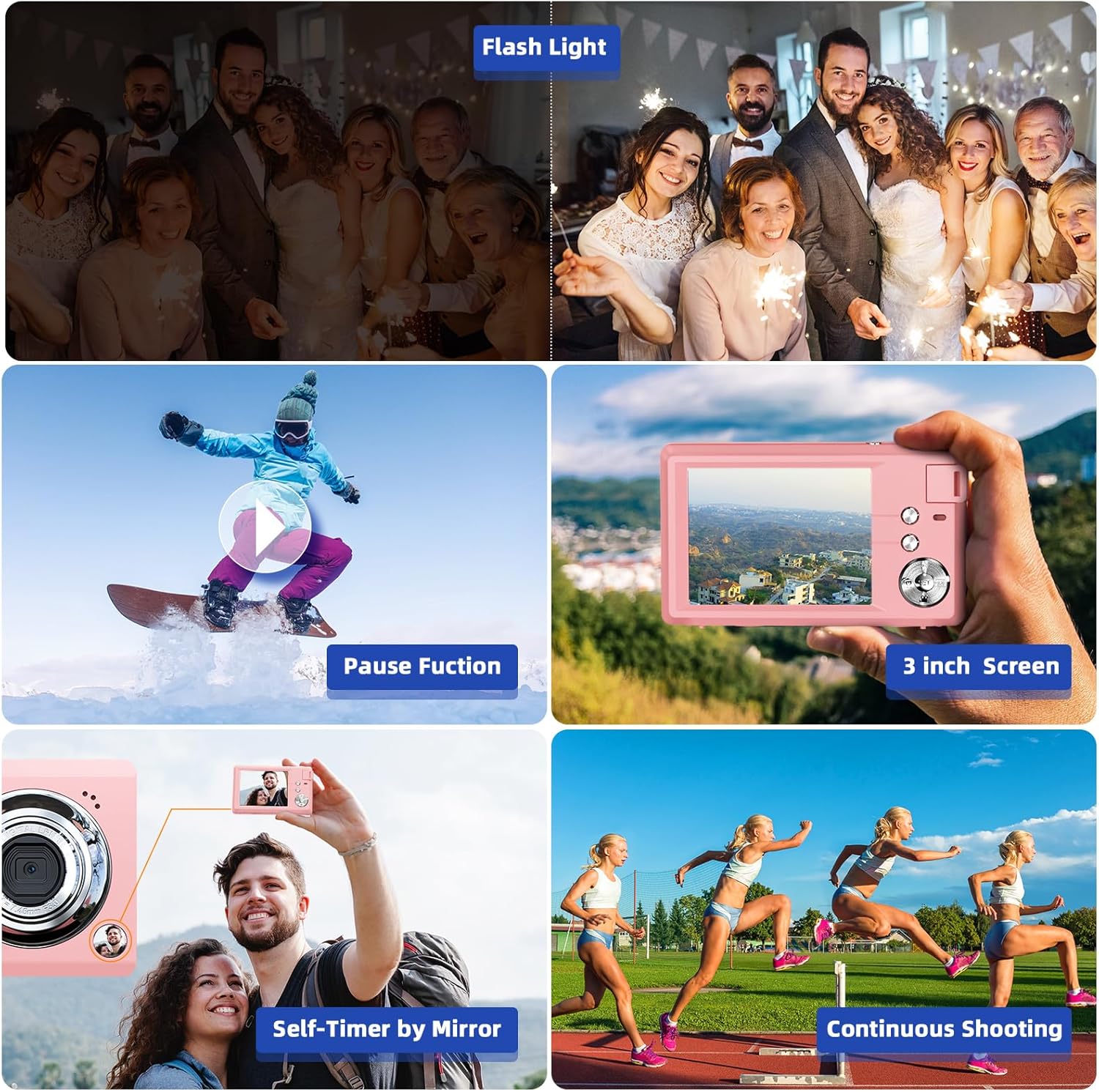 Цифров фотоапарат CCN, 48MP 1080P FHD фотокамера с 3.0-инчов екран, 16X цифрово увеличение, преносим компактен фотоапарат с 32GB TF карта, USB кабел, за тийнейджъри, възрастни, начинаещи, розов