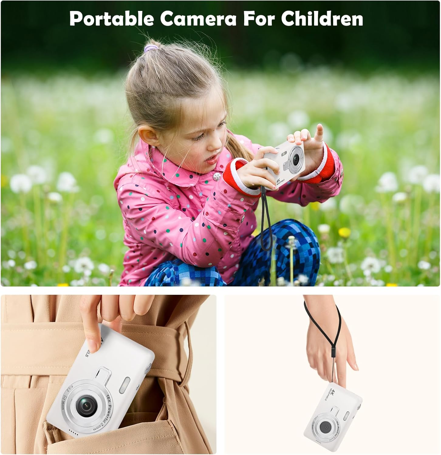 Този детски дигитален фотоапарат е много сладък, компактен и лек. С издръжливата презрамка за носене, децата могат да закачат фотоапарата на врата си и да го вземат навсякъде, което го прави лесен за носене по време на дейности на открито, като пикници, къмпинг и туризъм.