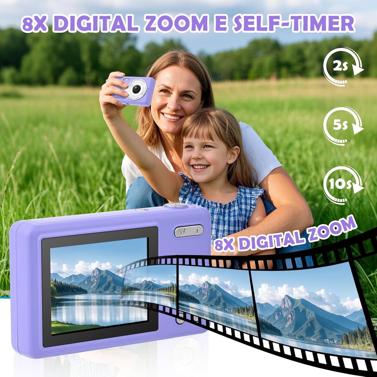 Чрез продължително натискане на бутона нагоре, детският фотоапарат може да реализира 8-кратно цифрово увеличение. Така те могат да практикуват снимане на красиви сцени на открито или на закрито и ефективно да заснемат отдалечени пейзажи.