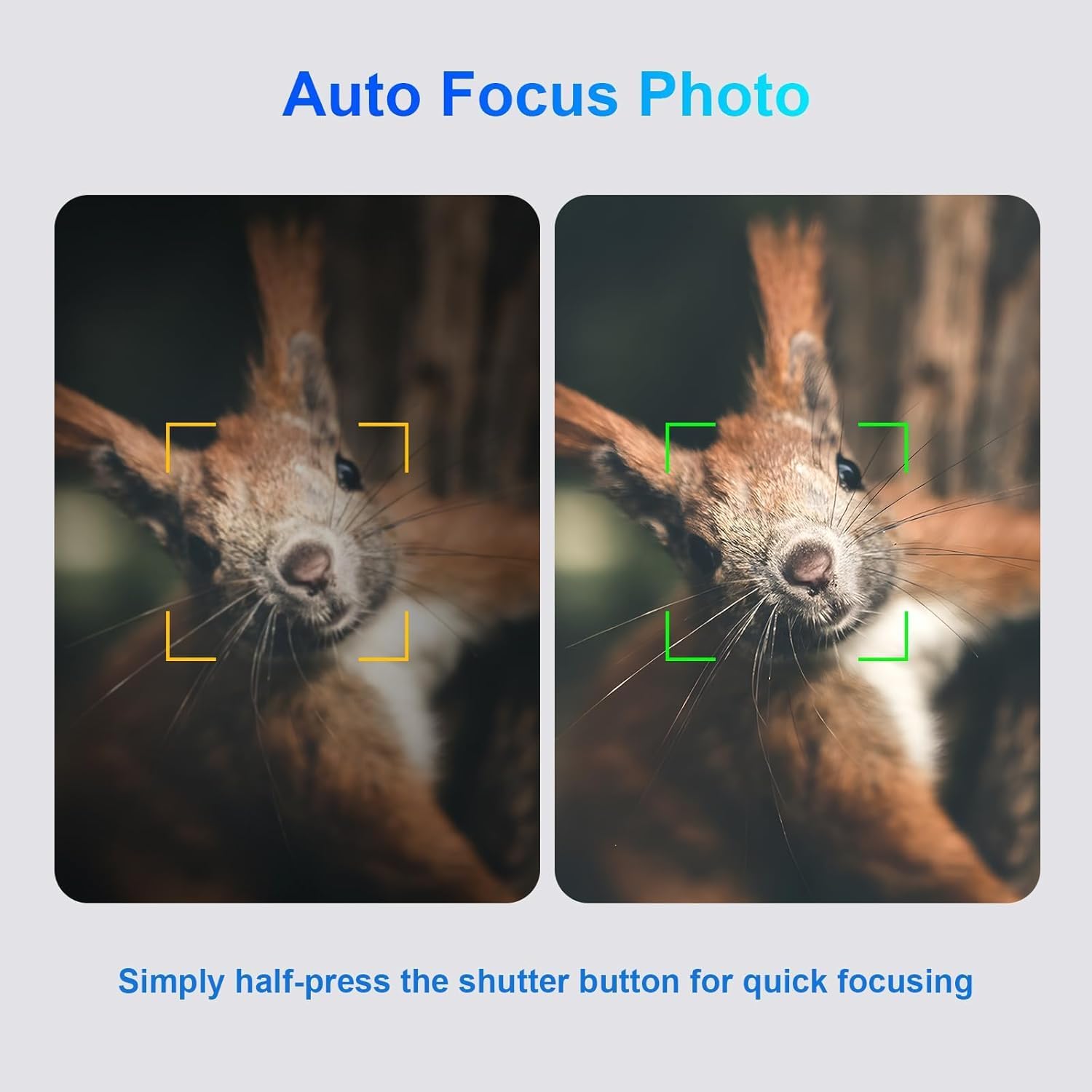 • HD дизайн с двоен екран: С двоен 2,8-инчов и 1,4-инчов IPS HD дисплей, тази водоустойчива камера предлага изключителни цветове и яснота, така че можете лесно да проверявате снимките си, когато правите селфита или видео. С интелигентните функции на уеб камерата, разпознаването на лица и функцията за непрекъснато снимане, всеки запис е стабилен, интелигентен и удобен. Независимо дали искате да документирате ежедневието си, да пътувате или да се наслаждавате на семейни събирания, тази камера отговаря на всички ваши разнообразни нужди.