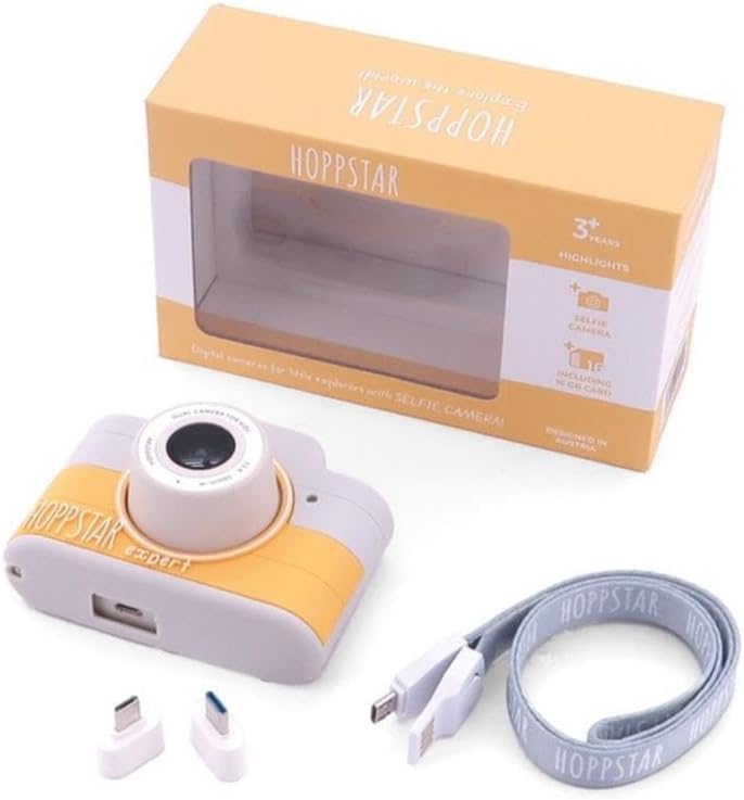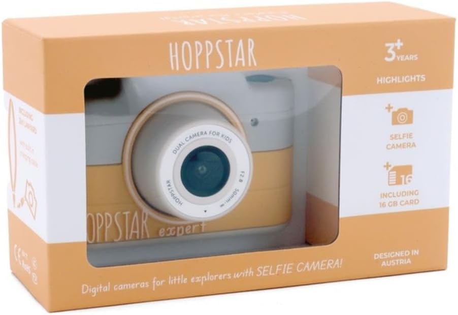 Произход на марката: Австрия Цвят: Жълт Възраст: от 3 години Цифровият детски фотоапарат Hoppstar Expert Citron със селфита - жълтият е идеалният детски фотоапарат с всички функции, от които се нуждаете всеки ден. Допълнителна селфи камера на гърба разполага с 1000 снимки и видеокамери с 16 GB място за съхранение. Той също така разполага със сменяем силиконов калъф за защита от счупване и лесно за използване меню. Цифровият детски фотоапарат Hoppstar Expert Citron със селфита - предлага популярни функции като жълти рамки, фото филтри и разпознаване на лица. Той помага на децата да развият своята креативност. В Toysall с удоволствие свързваме марката Hoppstar с децата в Турция. Технически данни: функция на предната камера, функция за снимки и видео. Всички снимки и видеоклипове се съхраняват на SD картата. Резолюция: фоторамка и филтър до 40MP с 3MP / интерполация Капацитет на батерията: 1000mAh Размер на екрана: 2.0" IPS, без докосване Пренос на данни чрез кабел (включително) Размер на продукта: 85 x 5.8 x 4.3 см Тегло на продукта: 95 грама Сертификация: CE, EN71, RoHS, CCC, MA Комплектът включва: 1 x камера и силиконов калъф 16 GB 1 x Type C адаптер 1 x Micro USB адаптер 2 в 1 каишка за носене и вграден кабел за зареждане. Допълнителни функции: автофокус, автоматичен баланс на бялото, автоматичен ISO баланс, автоматична корекция на цветовете, автоматична корекция на яркостта, разпознаване на лице, много различни езици на менюто. Важна информация: почиствайте цифровия фотоапарат само с леко влажна кърпа. Избягвайте пряка слънчева светлина или близо до източник на топлина. Пазете от влага и не докосвайте вода. Цифровият фотоапарат не може да се използва под вода или под вода! Избягвайте изпускането на фотоапарата върху твърди повърхности. Камерите Hoppstar трябва да се използват само под наблюдението на възрастен. Не прехвърляйте редовно фото или видео файлове, заснети с други камери, към детския фотоапарат Hoppstar, за да не се повредят.