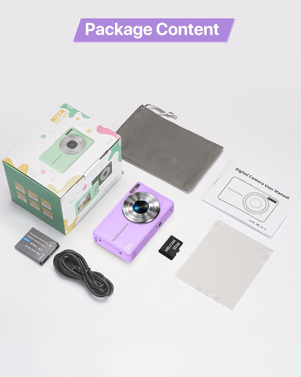 Цифрова камера 1080P камера 44MP камера Преносима компактна камера с 2.4-инчов LCD екран, 16x цифрово увеличение, 32G микро карта памет, 1 батерия за деца, тийнейджъри, студенти, начинаещи, лилава