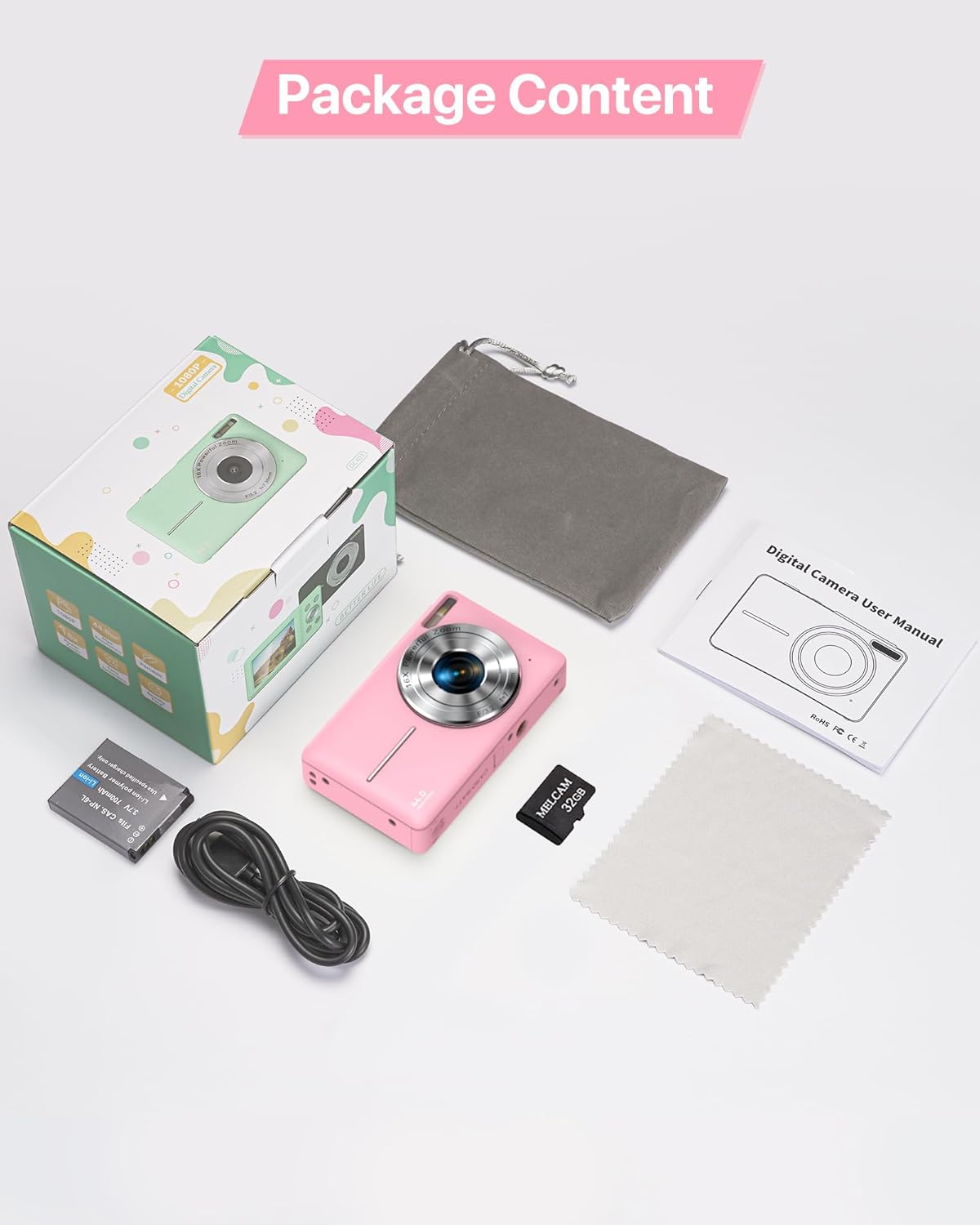 Цифрова камера 1080P камера 44MP камера Преносима компактна камера с 2.4-инчов LCD екран, 16x цифрово увеличение, 32G микро карта памет, 1 батерия за деца, тийнейджъри, студенти, начинаещи, розова