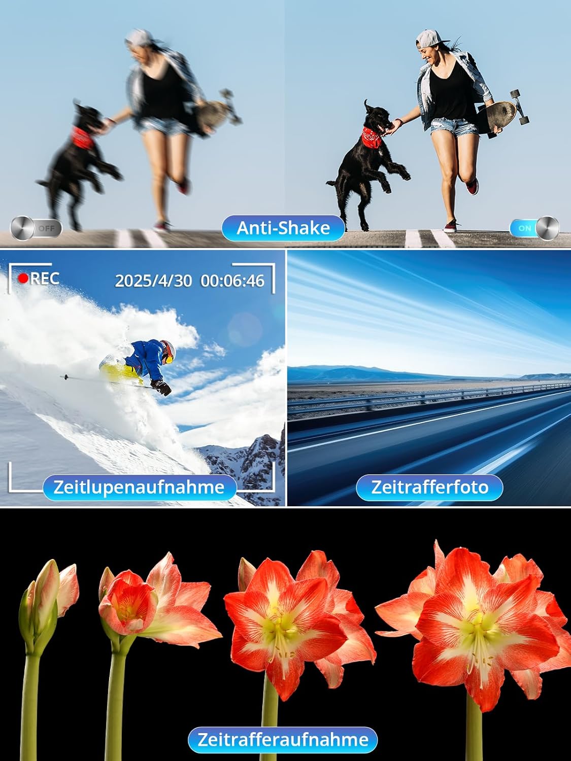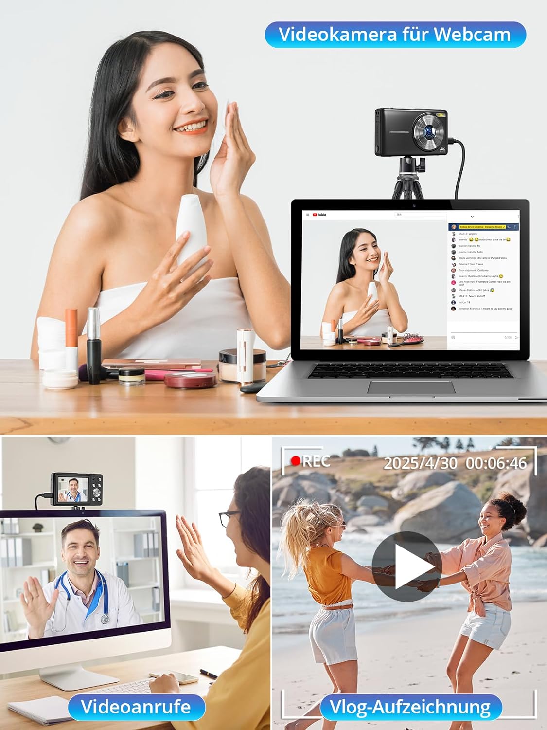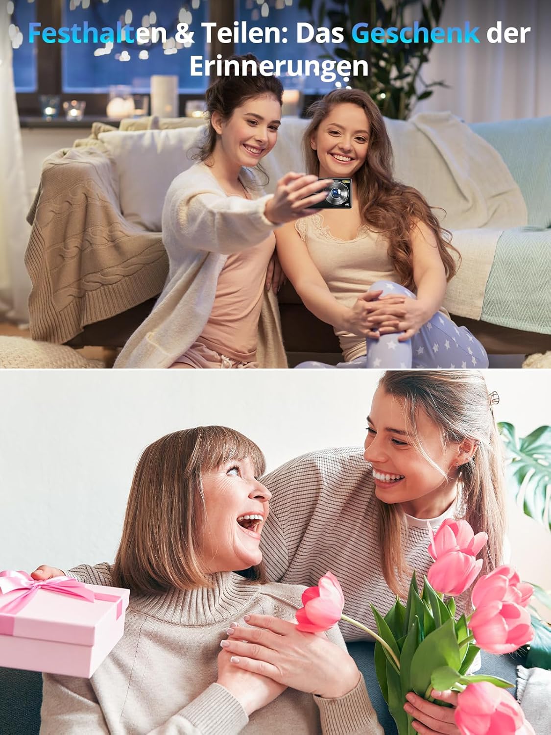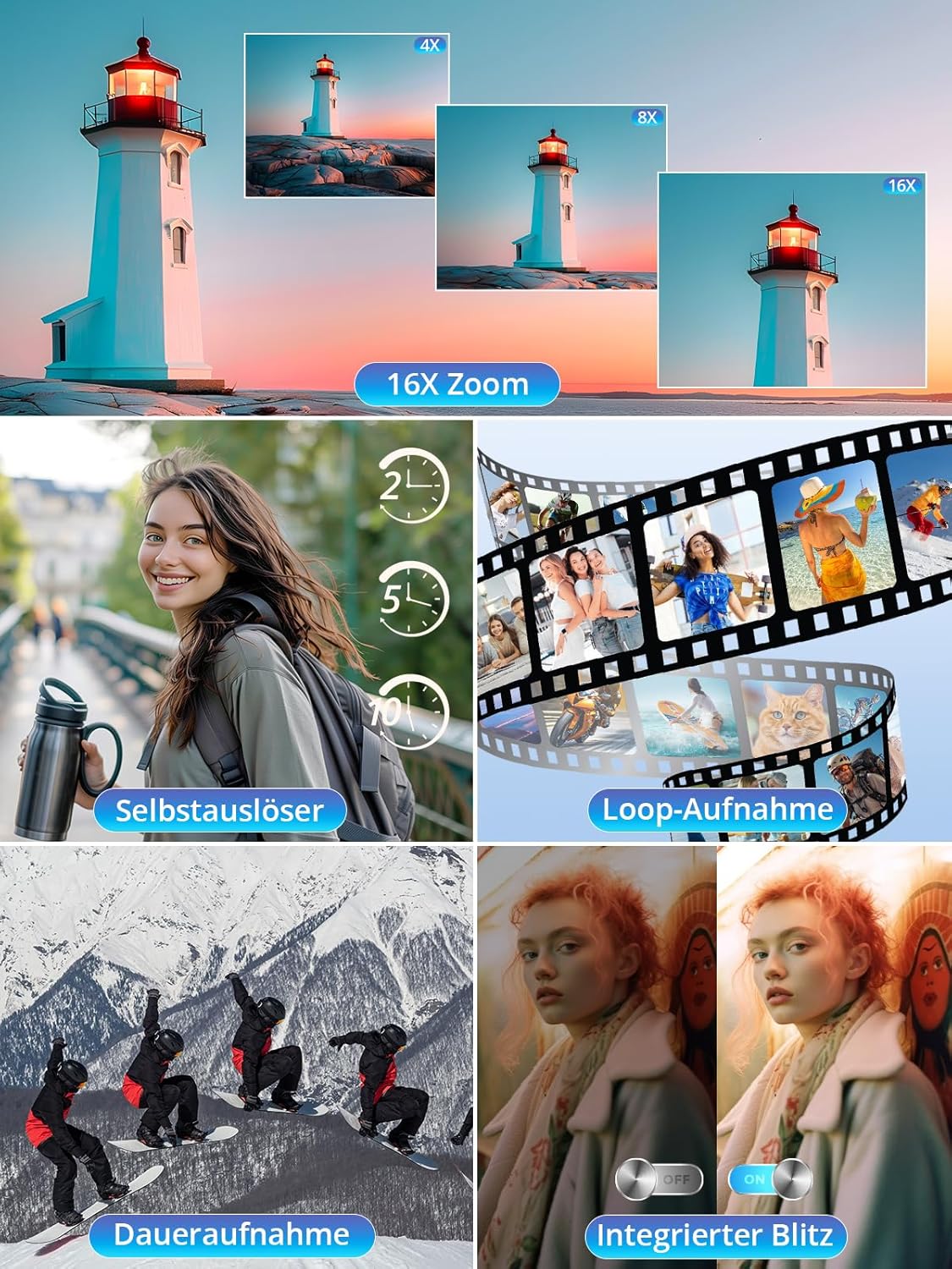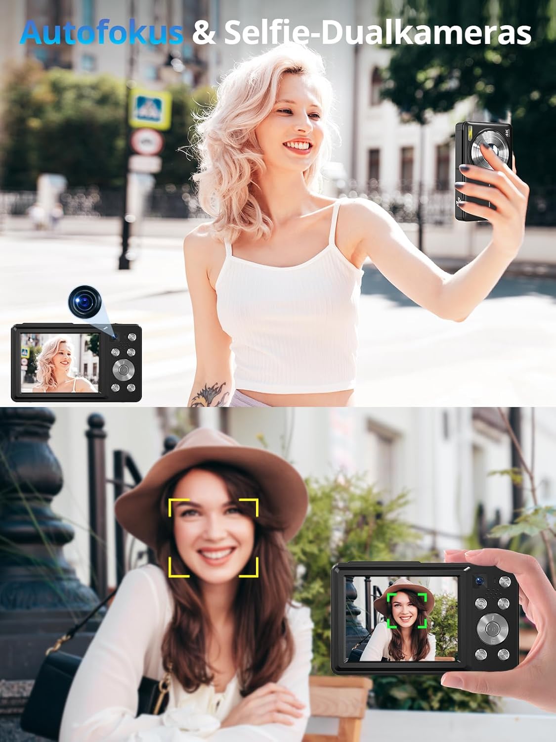 • Многофункционален цифров фотоапарат за деца, тийнейджъри и начинаещи: Този цифров фотоапарат съчетава 16-кратно увеличение, вградена светкавица и 20 креативни филтъра за подобряване на снимките. 2,4-инчовият IPS екран осигурява ярки визуализации, селфита с ограничено време (2/5/10 секунди) и съвместимостта с уеб камера стимулират игривото учене. Технологията против трептене и разпознаването на лице/усмивка осигуряват резки и фокусирани снимки. Универсален фото фотоапарат за пътуване, влогване или креативни проекти.