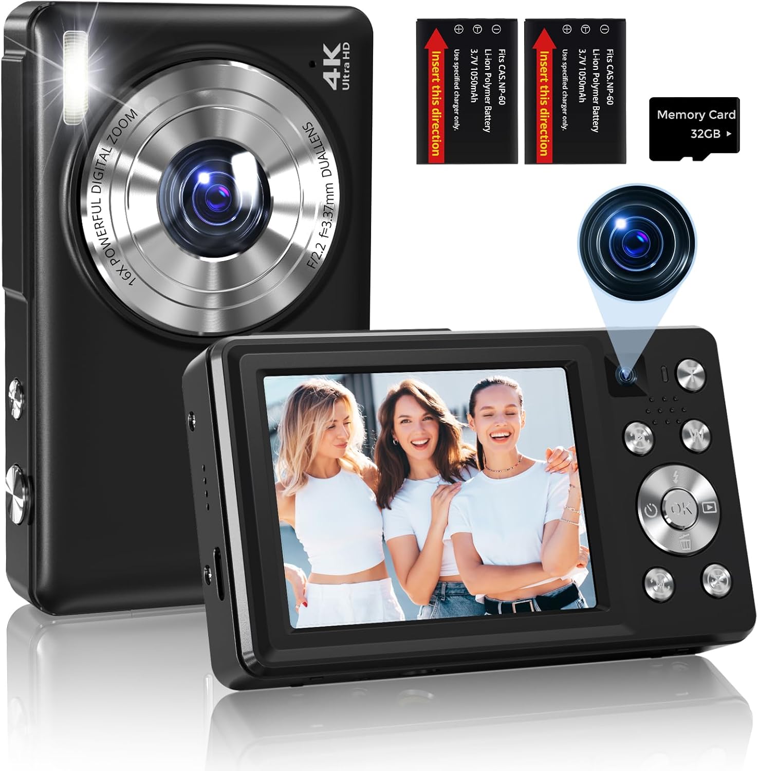 Цифрова камера 4K 64MP камера с автофокус, компактна влог камера с двоен обектив, 2.8-инчов екран, 16x цифрово увеличение, 2 батерии за деца, тийнейджъри, начинаещи, черна