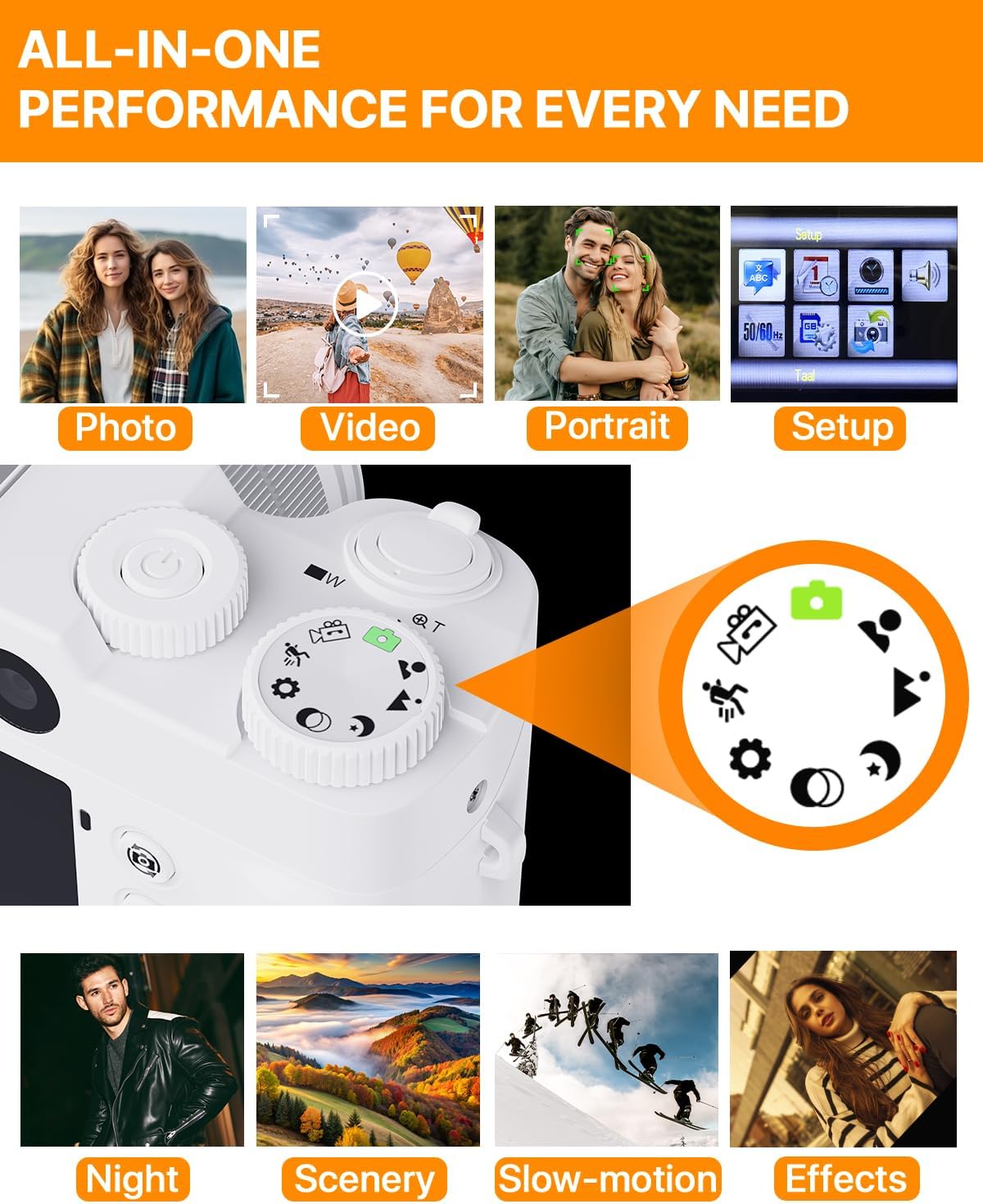 • 64MP 4K HD цифров фотоапарат: Благодарение на подобрения CMOS сензор, този цифров фотоапарат заснема 64MP изображения и 4K видеоклипове с висока резолюция и предоставя изключително детайлно и рязко качество на изображението. Проектиран специално за начинаещи, той предлага интуитивно управление - просто завъртете горния диск, за да превключвате без усилие между различни режими (снимка, видео, забавен каданс и др.).