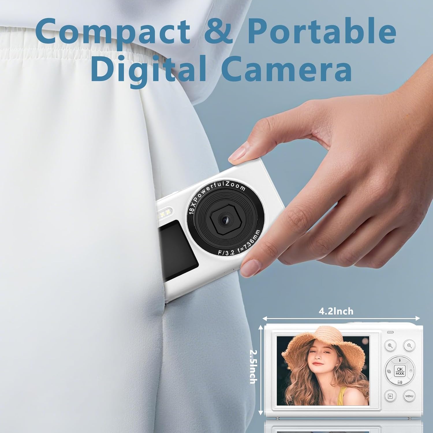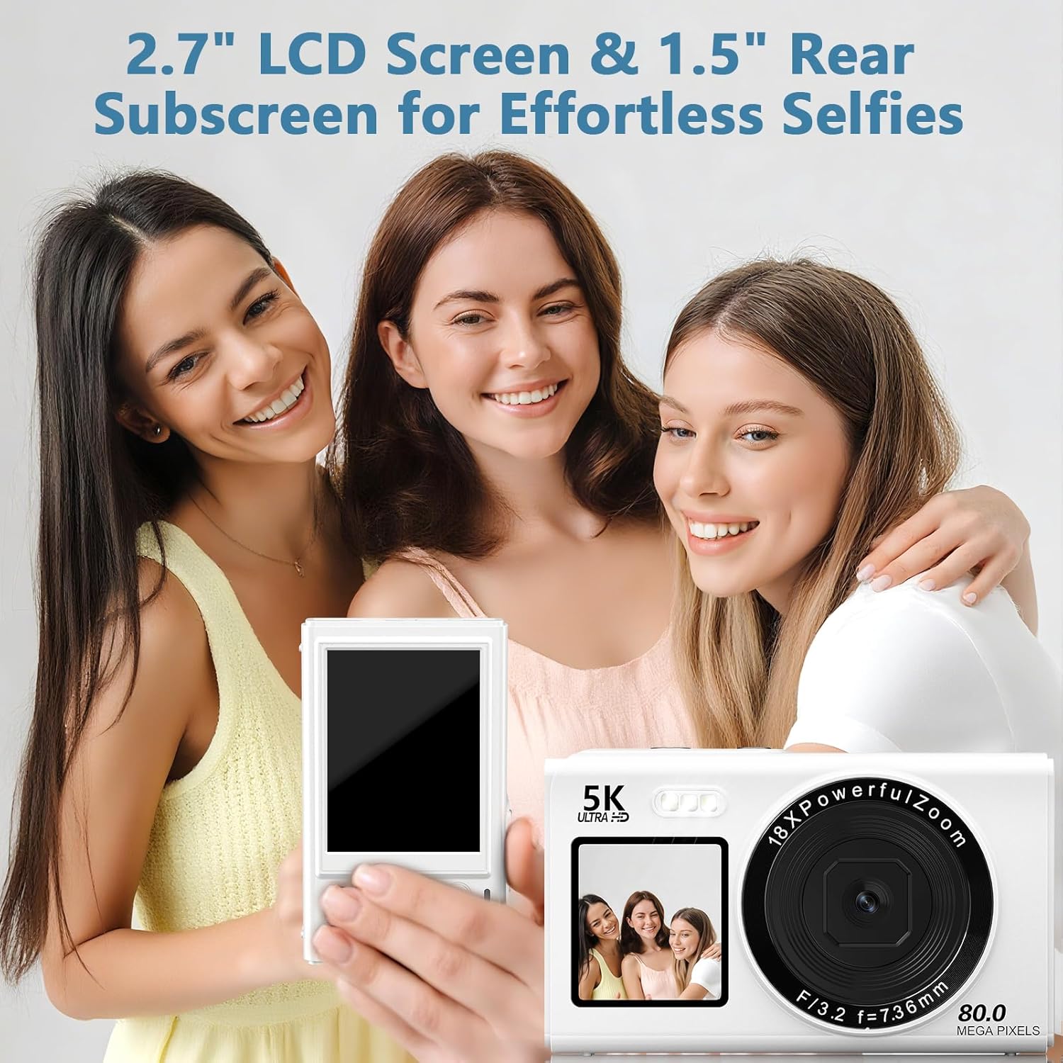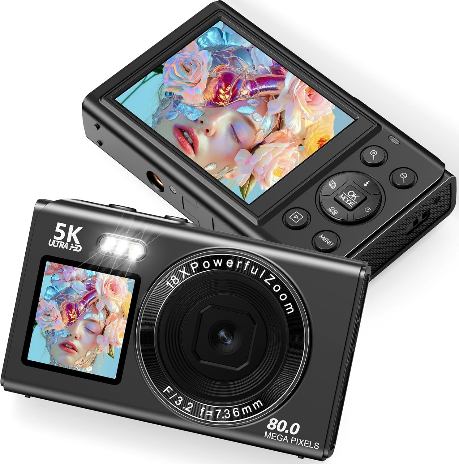 Цифрова камера 5K 80MP с WiFi, 2.4-инчов LCD и 1.5-инчов селфи дисплей, 18X увеличение, 32GB TF карта, компактна камера за влогове, преносима камера за тийнейджъри, начинаещи и възрастни, бяла