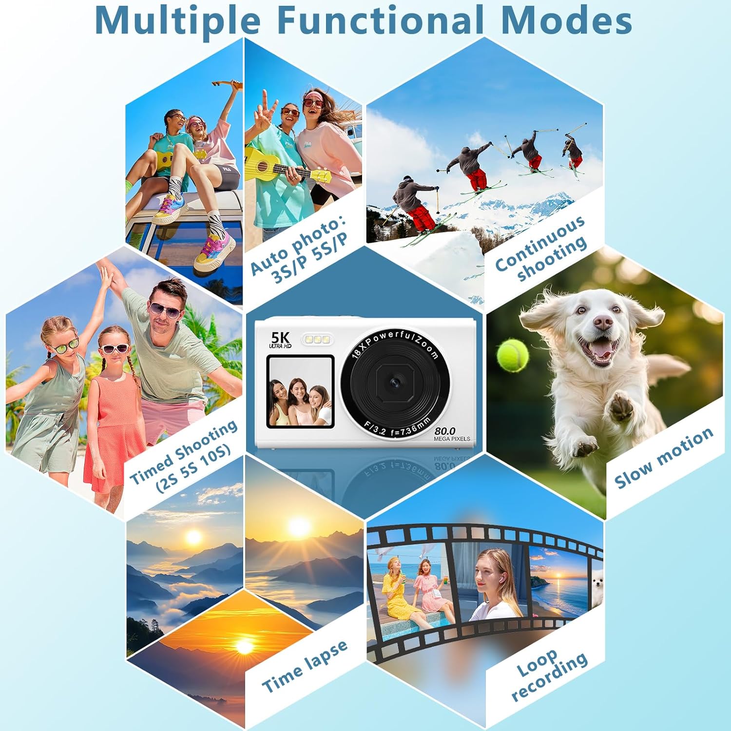 • Снимки с ултрависока резолюция 80MP и 5K видеоклипове: оборудван с усъвършенстван 1200MP CMOS сензор, този компактен фотоапарат предоставя изключително ясни изображения. Уловете всеки детайл в брилянтни 80MP снимки и плавни 5K видеоклипове дори при слаба светлина.