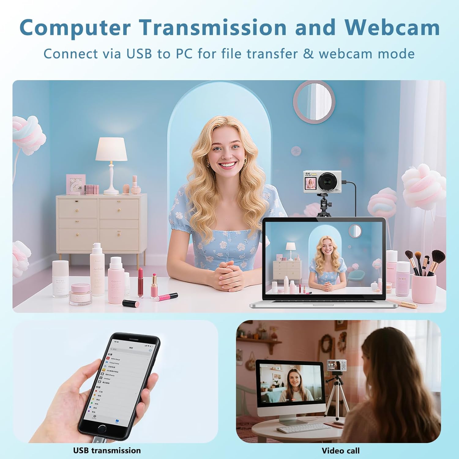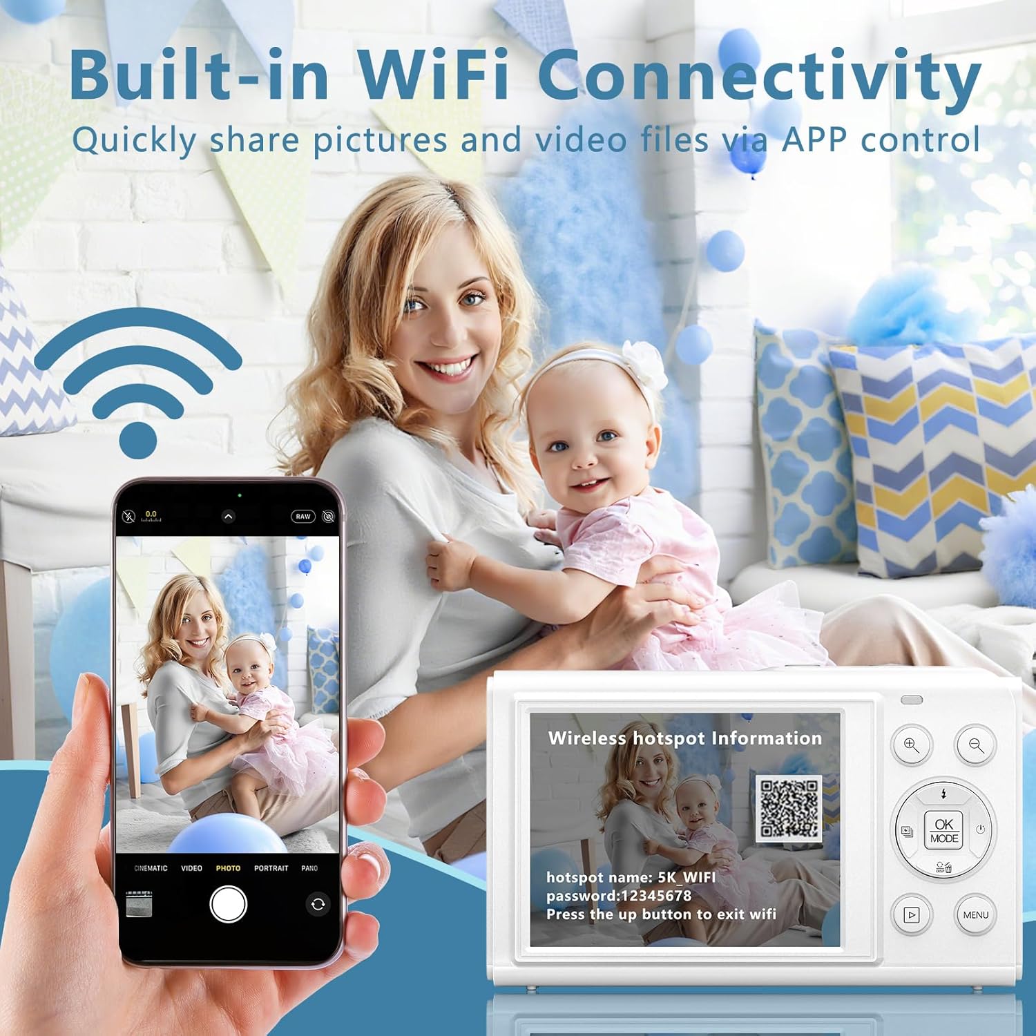 • WiFi връзка и функция за уеб камера: лесно свържете камерата чрез приложение за дистанционно управление или безжичен трансфер на данни. Свързана с компютъра чрез USB, тя може да се използва и като висококачествена уеб камера за стрийминг на живо, видеоконферентна връзка или онлайн уроци.