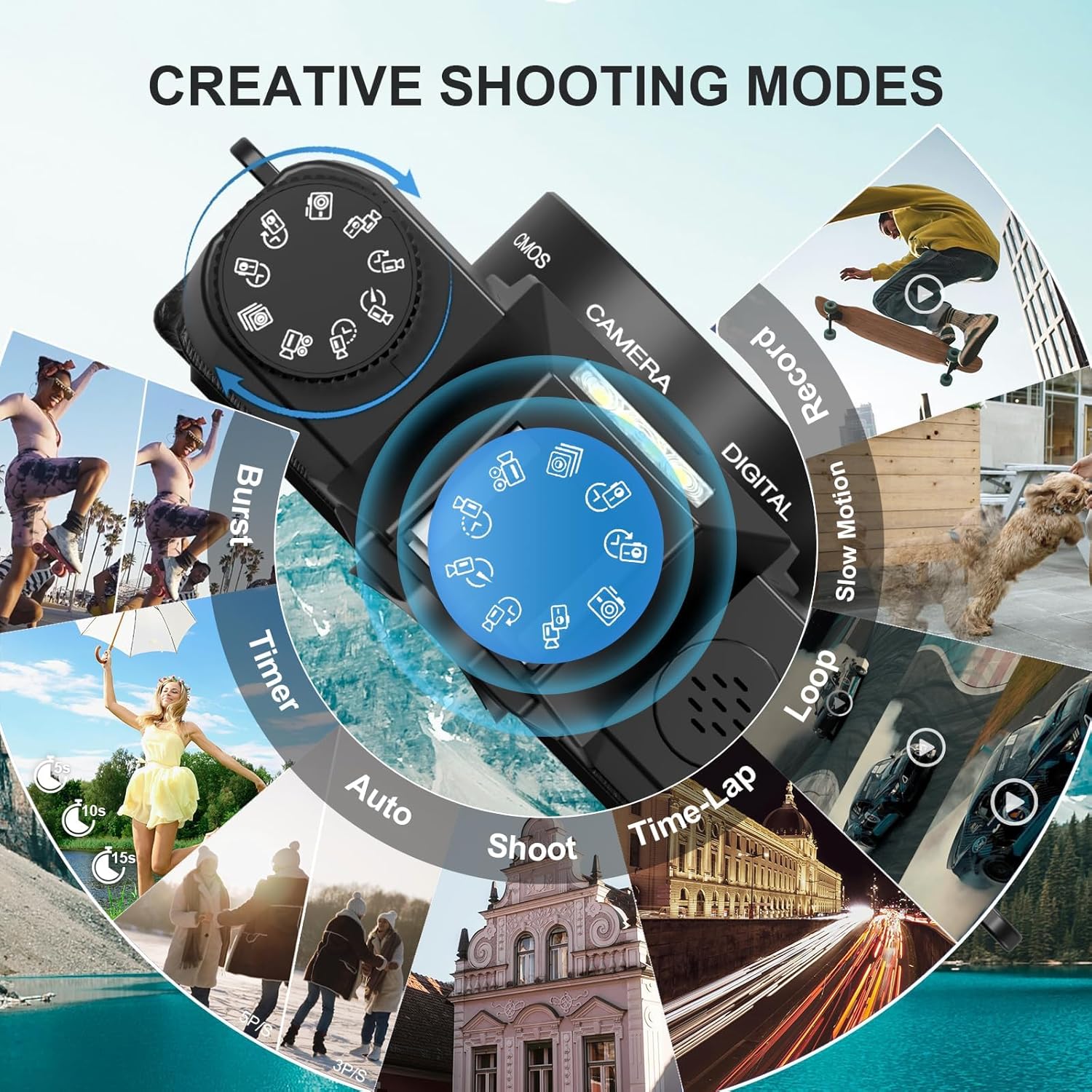 • 【Бързо превключване на функции】: Тази камера предлага разнообразие от функции за запис и влог. С едно натискане на бутон можете лесно да превключвате между автоматичен запис, режим с таймер, непрекъснато снимане, забавен каданс, timelapse и цикличен запис. В допълнение, вградените функции за красота и филтри добавят креативен щрих към вашите снимки. Независимо дали записвате динамични сцени или видео, тези режими покриват всички ваши нужди.