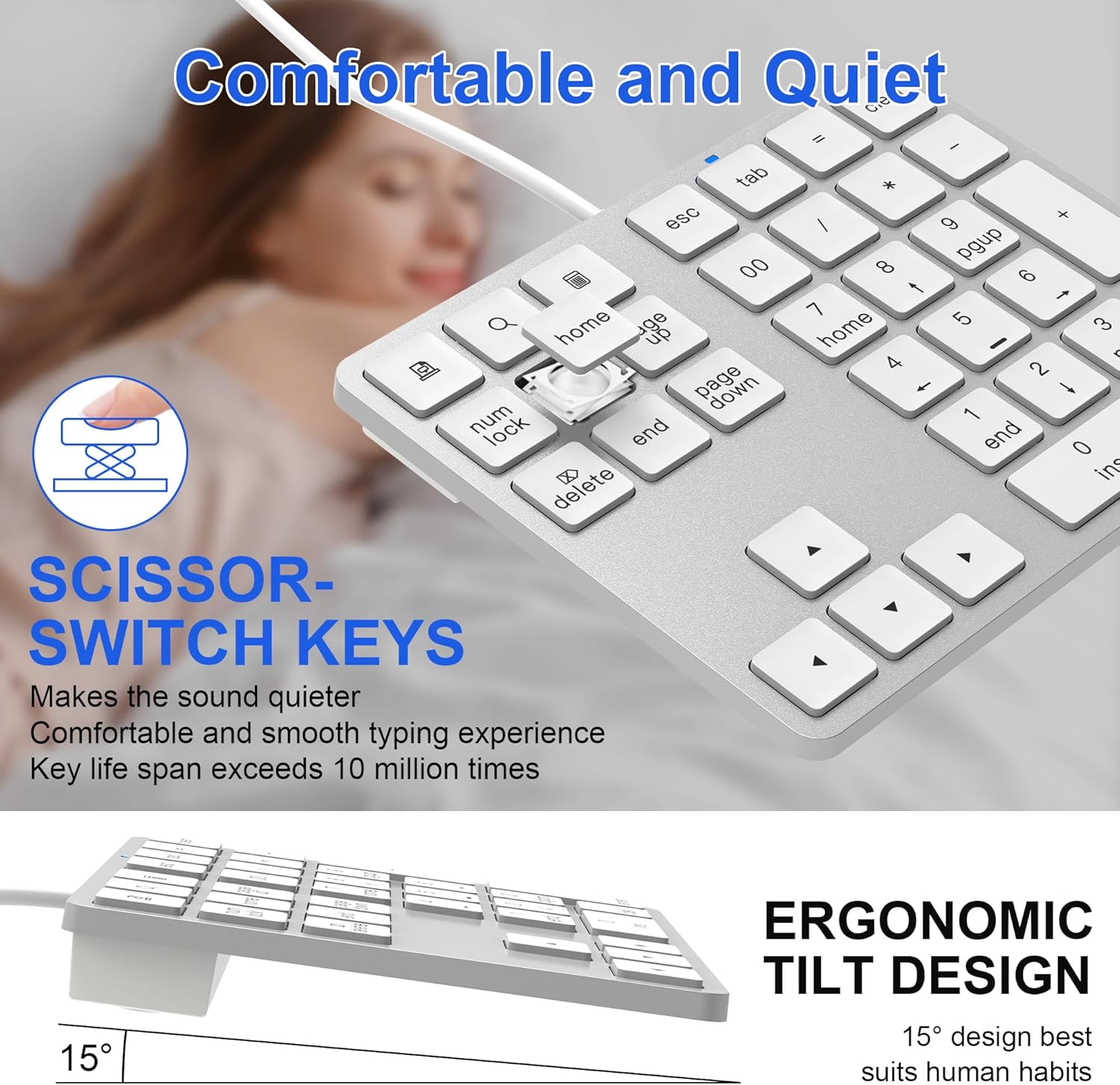 Разполага с X-образна структура на бутоните за повдигане и дизайн с 15° накланяне, за да осигури ергономично, по-тихо и по-комфортно писане.