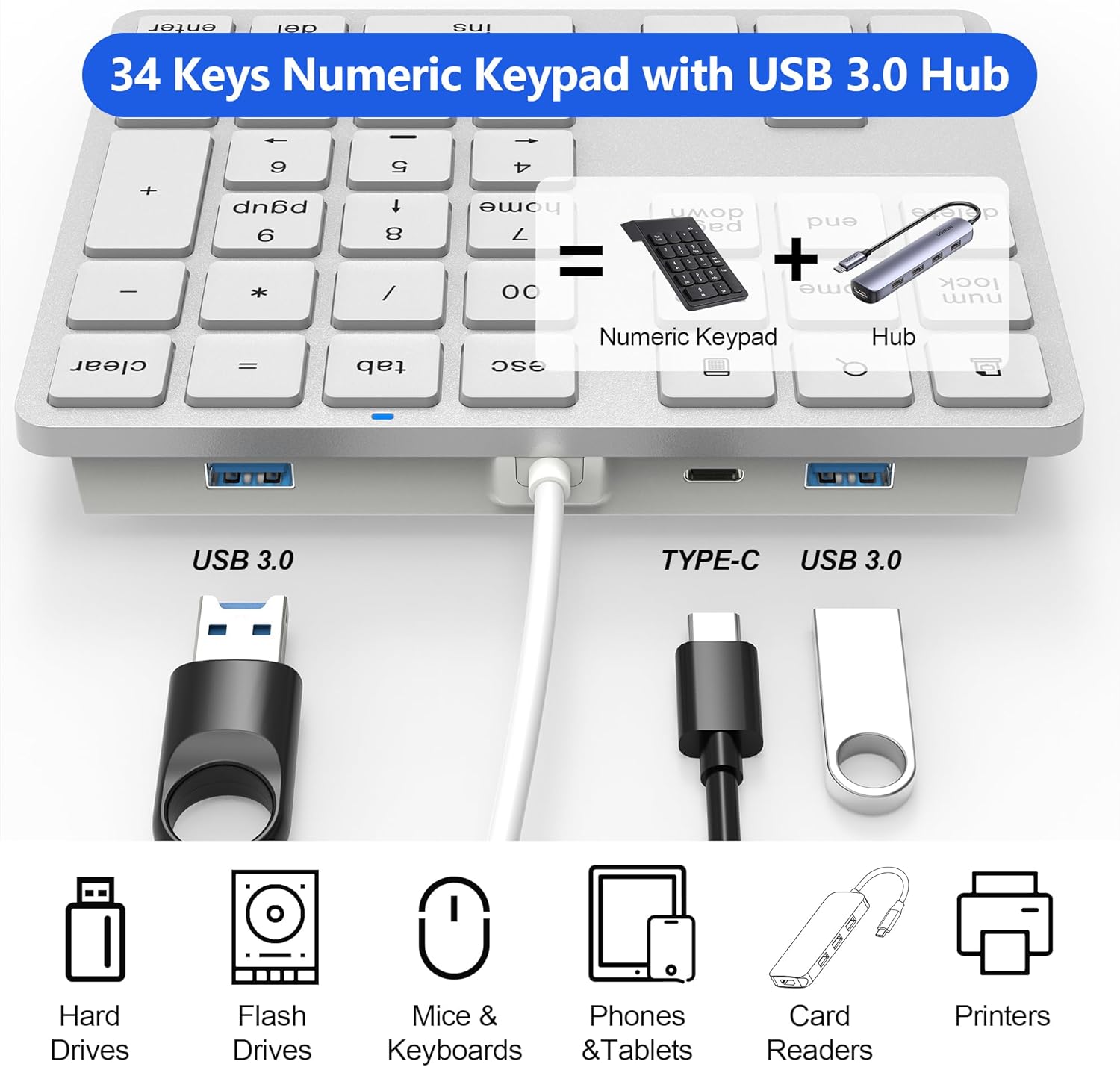 Compatible with: Mouse, number pad, USB stick, hard drive, mobile phone, tablet, card reader, printer, etc.