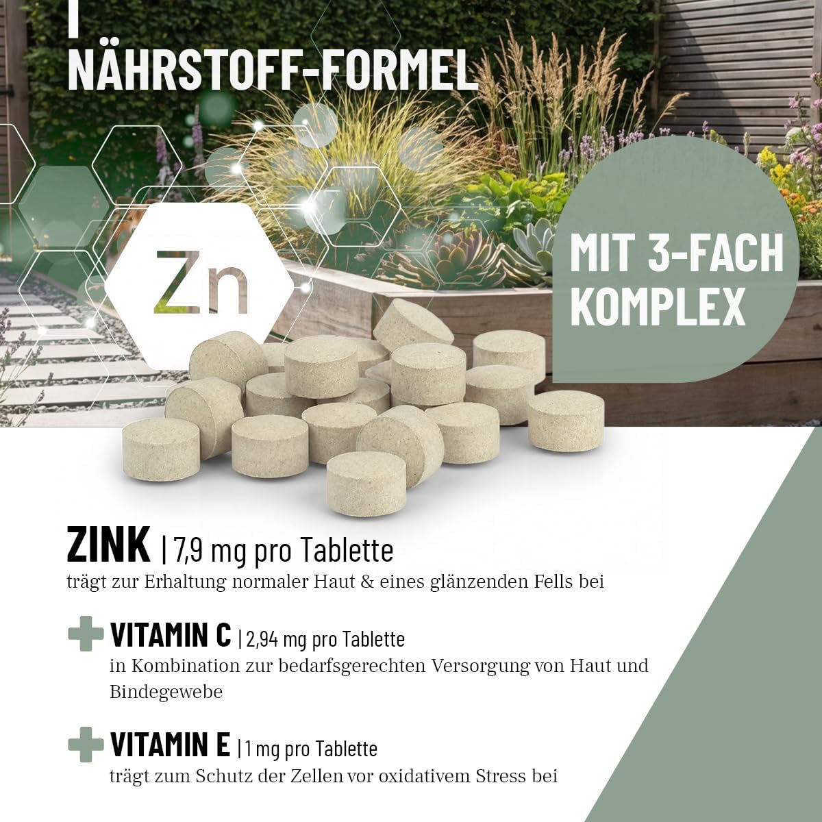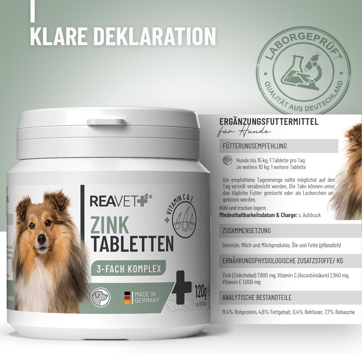 Състав: Зърнени храни, мляко и млечни продукти, растителни масла и мазнини | Аналитични съставки: 11,4% суров протеин, 4,6% съдържание на мазнини, 0,4% сурови фибри, 7,7% сурова пепел | Хранителни добавки на кг: Цинк (цинков хелат) 7900 мг, Витамин C (аскорбинова киселина) 2940 мг, Витамин E (all-rac-алфа-токоферил ацетат) 1000 мг