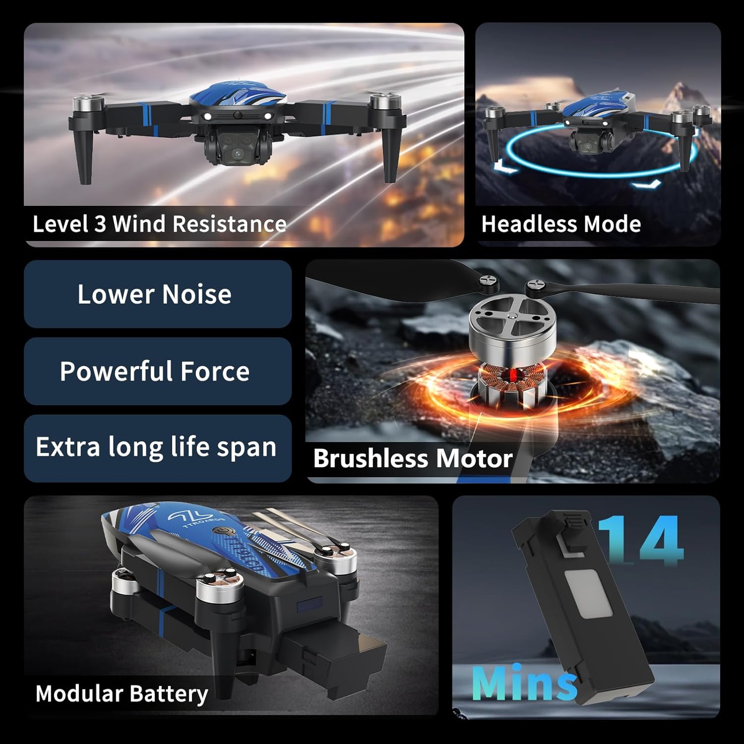 • Безчетков мотор: 4k дронът разполага с мощни безчеткови мотори, които осигуряват стабилна работа, нисък шум и стабилна производителност, за да се справя лесно с различни метеорологични условия. Благодарение на удължения си експлоатационен живот, той намалява дългосрочните разходи за поддръжка. С три режима на скорост, той се адаптира към различни сценарии на полет, така че можете да се съсредоточите върху тръпката от летенето и въздушната фотография.
