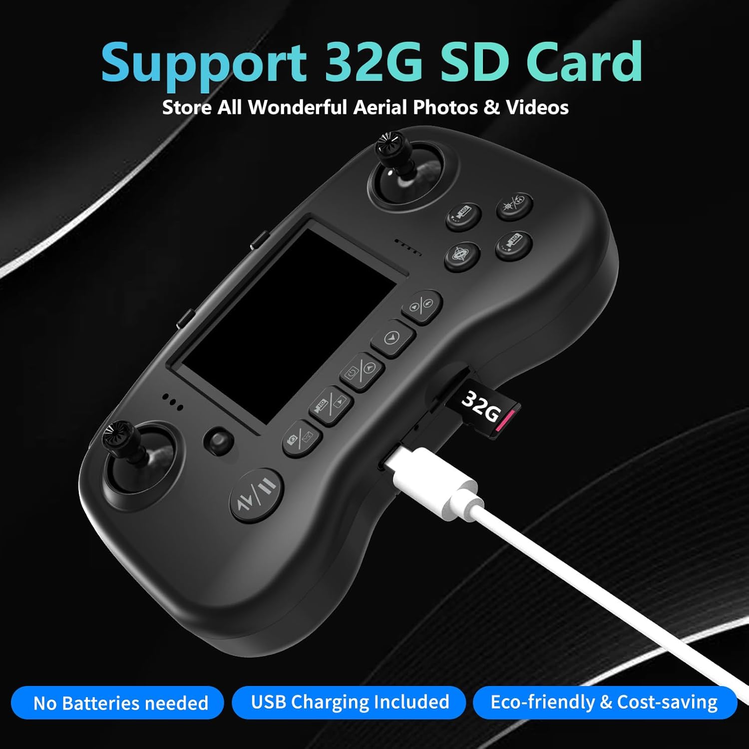 • 2,8-инчов дисплей: дронът има 2,8-инчов HD екран, който осигурява изключително рязко и плавно предаване на видео в реално време. Можете лесно да преглеждате записите по всяко време, без да се налага да разчитате на мобилен телефон. С поддръжка на SD карти до 32 GB, голямото пространство за съхранение позволява по-дълги записи. Независимо дали става въпрос за семейни тържества или приключения на открито - дронът винаги предоставя висококачествени изображения. Интуитивното управление осигурява още по-интензивно и безпроблемно изживяване.
