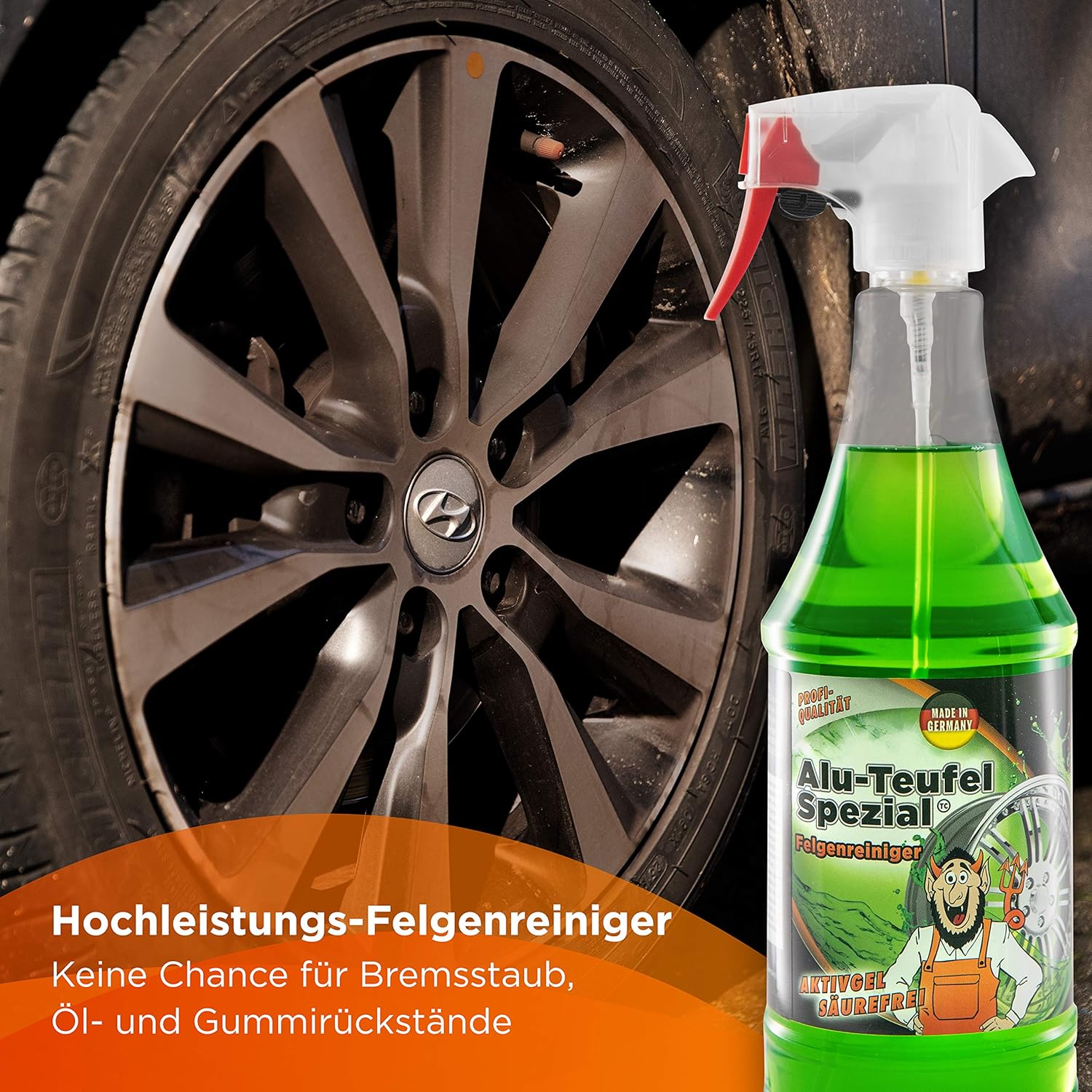 Cleaning is done automatically: spray on, leave to work and rinse with a powerful jet of water. Strong against brake dust, gentle on the rim. The Alu-Teufel Special is acid-free and therefore ideal for regular rim care. Suitable for all rims (including chrome, multi-piece and high-quality rims). During the active cleaning phase, the cleaner turns reddish.
