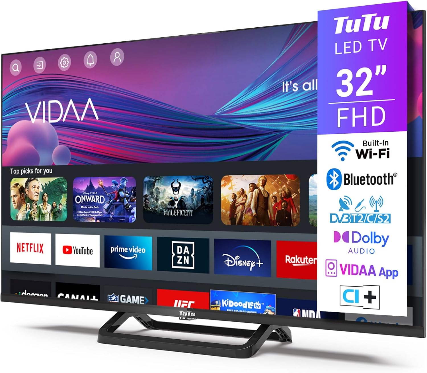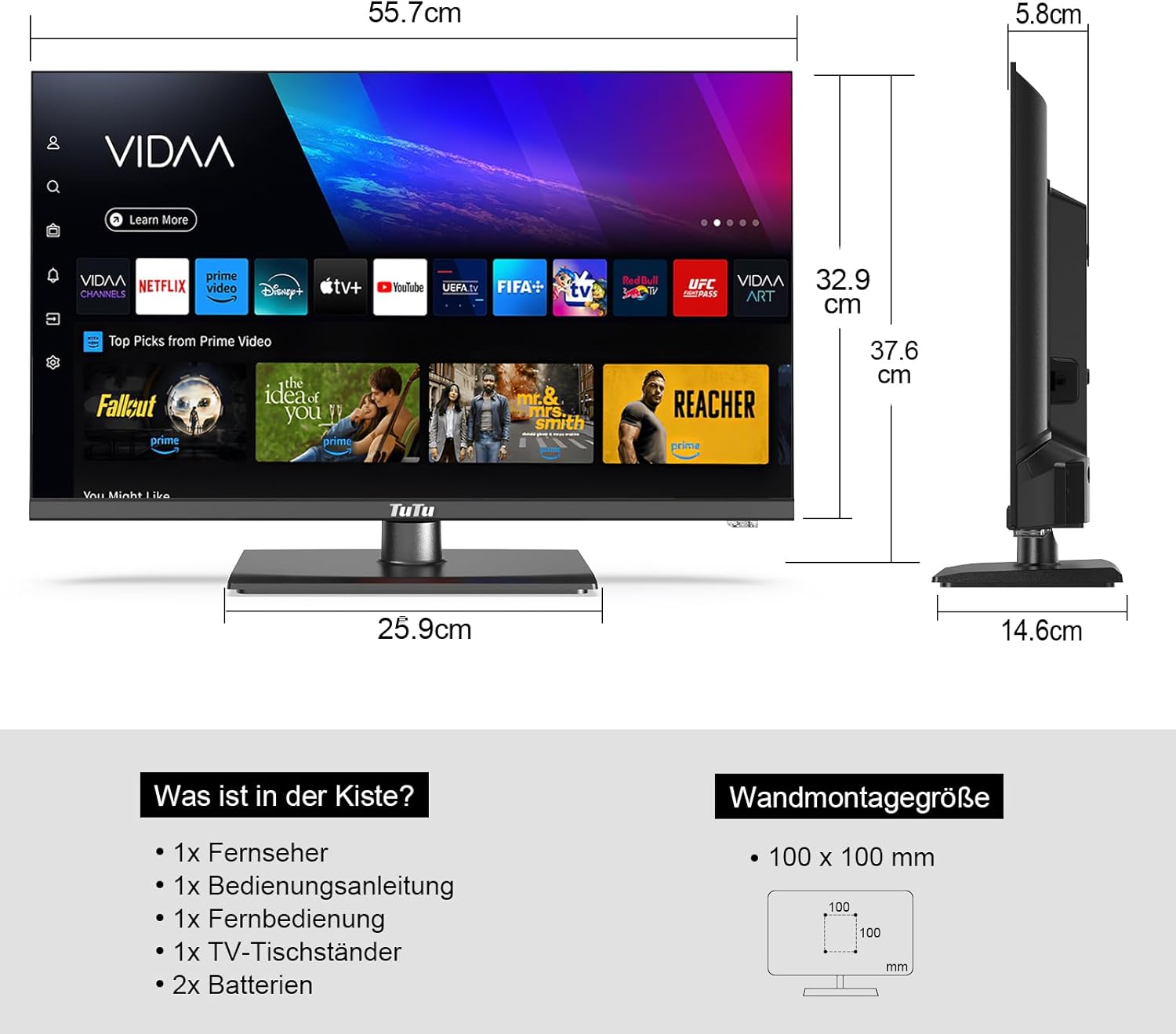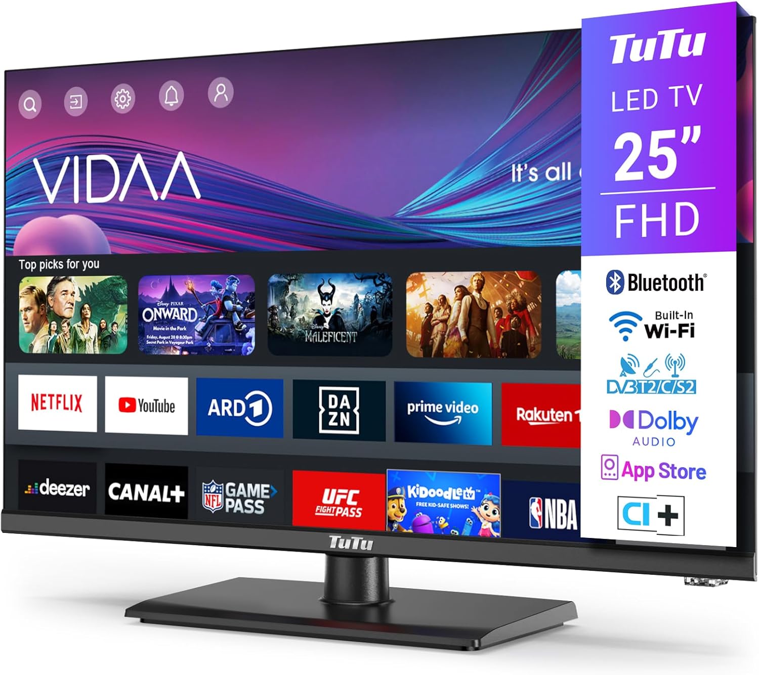 TuTu телевизор 25 инча (64 см), Full HD Smart телевизор с Bluetooth, Wi-Fi, троен тунер (DVB-T/T2, DVB-C, DVB-S/S2), App Store, централна стойка [2025]