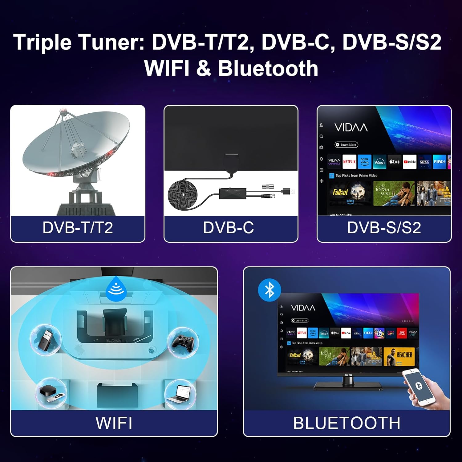 • Прием: DVB-T2 (ефирно), DVB-C (кабелно), DVB-S2 (сателитно)