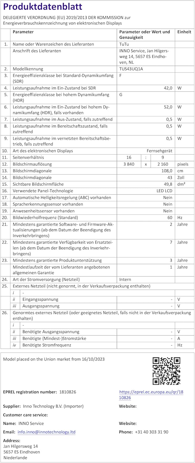 TuTu TUS43UQ1A Smart TV 43 инча (108 см) 4K UHD LED телевизор Android TV с Wi-Fi, HDR, троен тунер DVB-C/S/S2/T/T2, Bluetooth, Prime Video, Netflix, YouTube, DAZN, Disney+