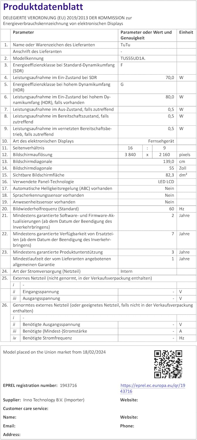 TuTu TUS55UD1A Smart TV 55 инча, 4K UHD Android TV с Wi-Fi, HDR, HLG, APP Store, троен тунер (DVB-C/S/S2/T/T2), Bluetooth, HDMI, USB