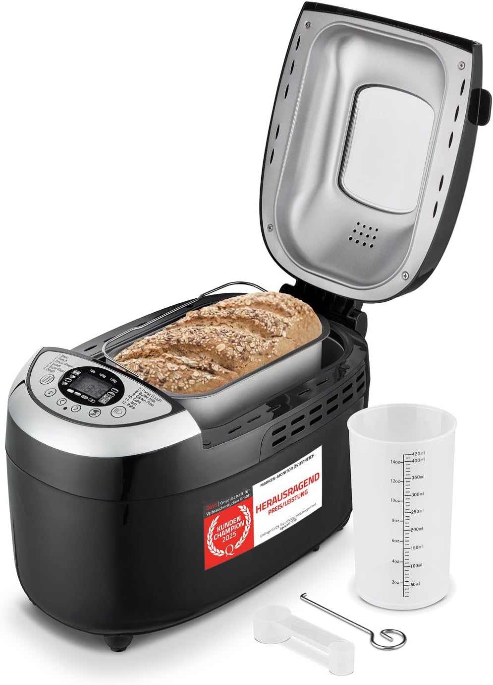 TZS First Austria - Хлебопекарна с 12 автоматични програми 850 W - Напълно автоматична хлебопечка с капацитет 700-1250 г - Хлебопекарна с прозорец за наблюдение, таймер, аксесоари и функция за затопляне - Черна