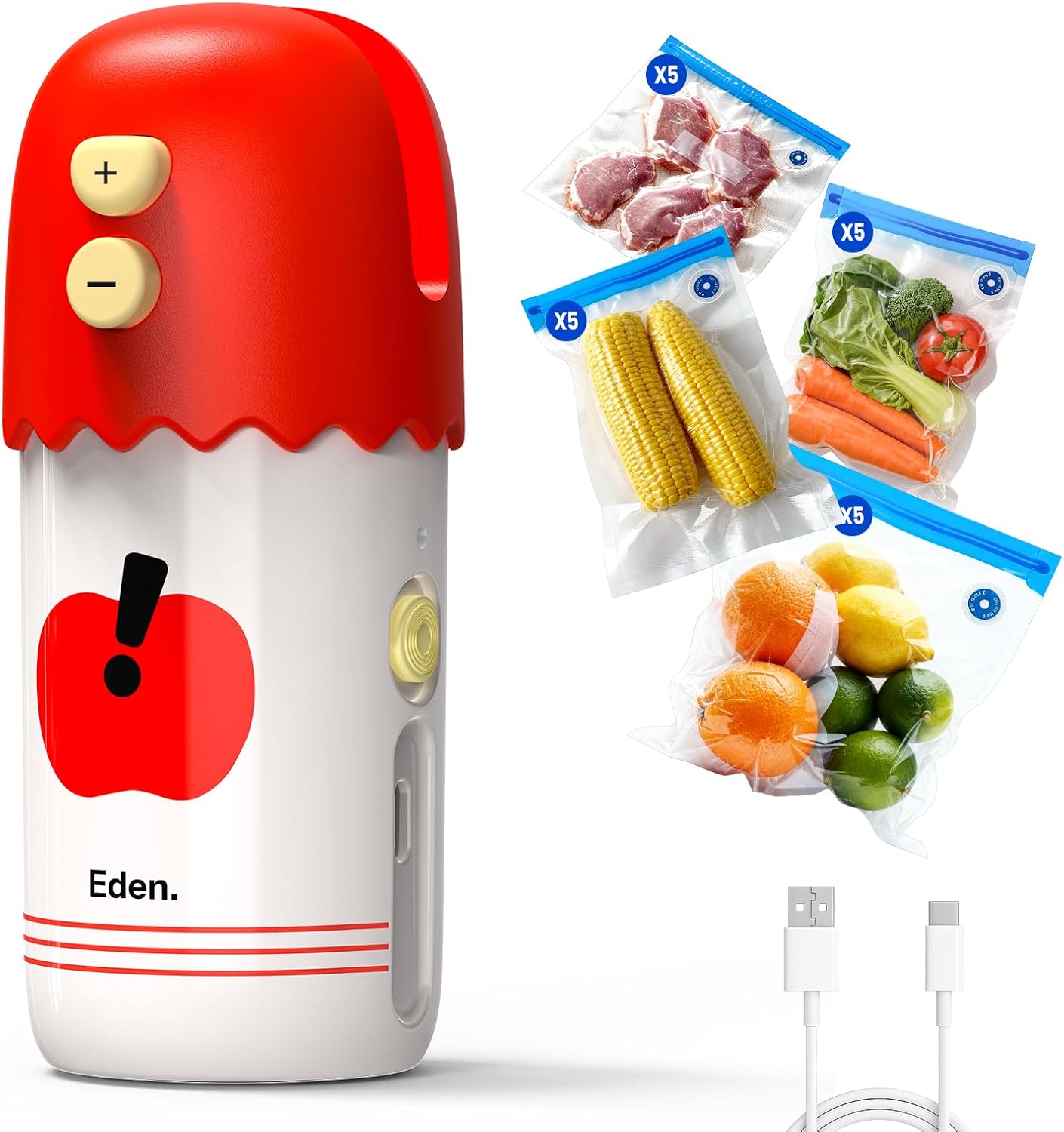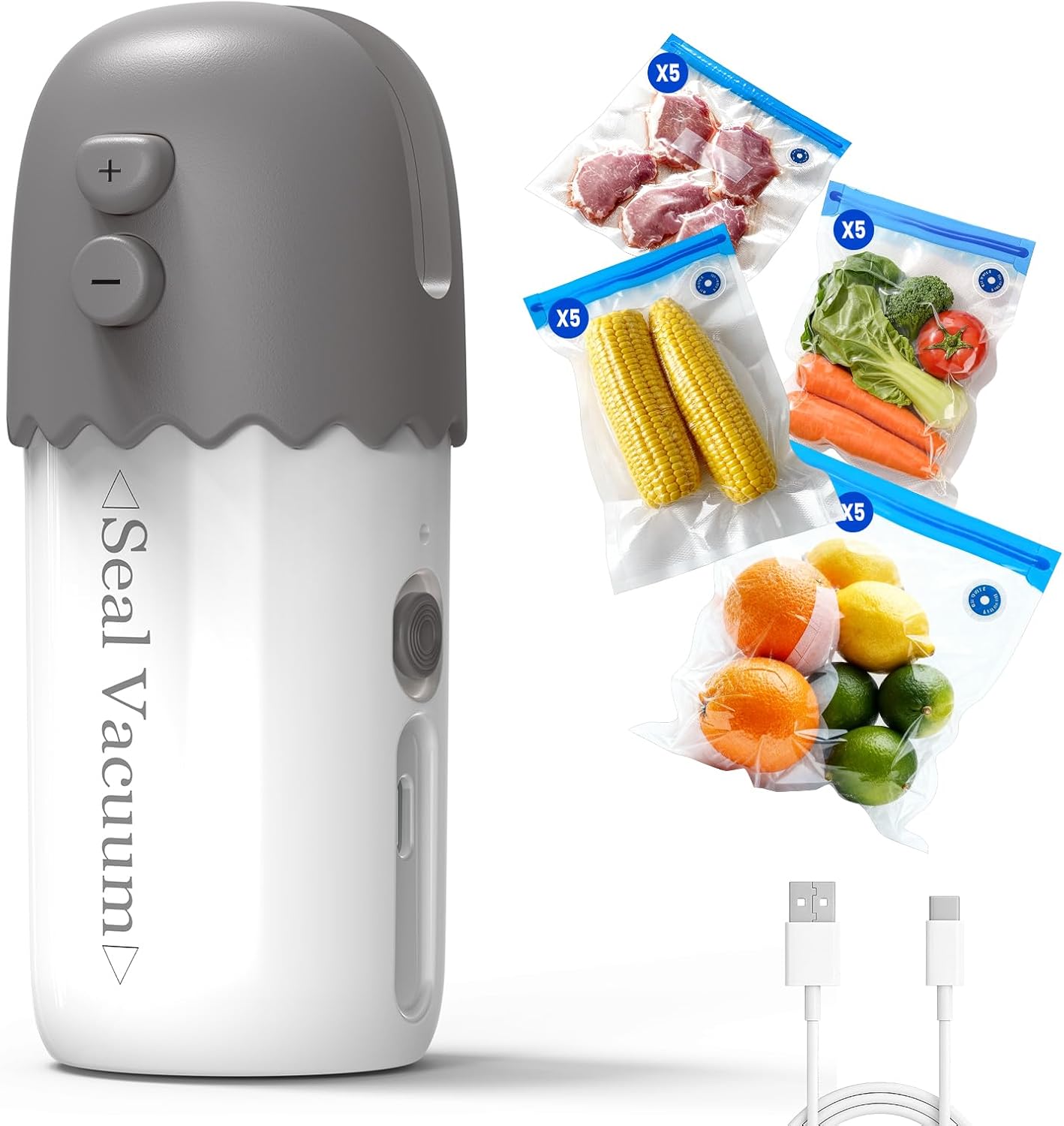 • Богати аксесоари: уредът за запечатване на торбички се предлага с 20 вакуумни торбички за многократна употреба за храна (4 размера), много подходящи за консервиране на прясно месо, зеленчуци, плодове и други храни; помага ви да съхранявате всякакви пресни храни