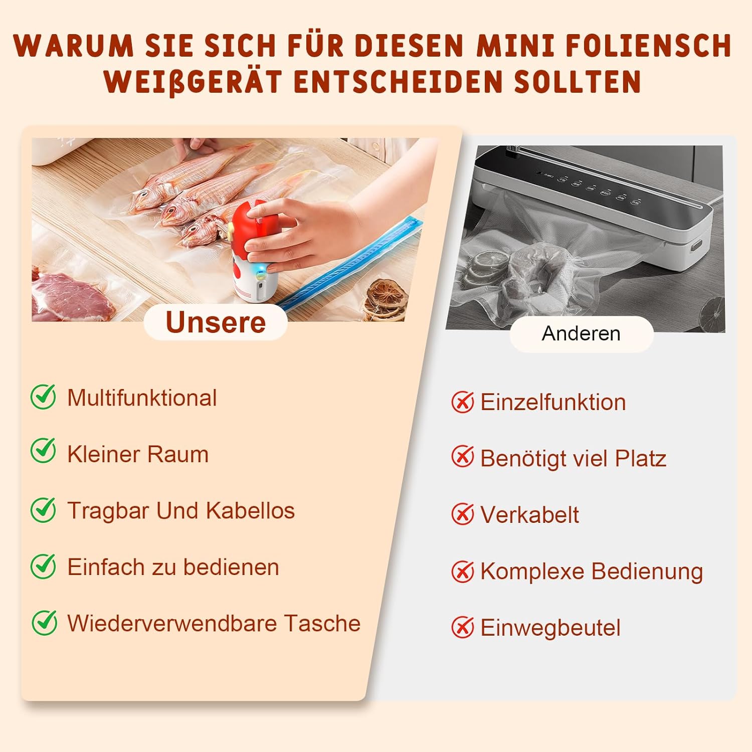 • Малка вакуумна запечатваща машина 3 в 1 - Тази удобна вакуумна запечатваща машина съчетава функции за запечатване, рязане и вакуумно запечатване. Тя има запечатваща глава със скрито острие и вакуумна глава.