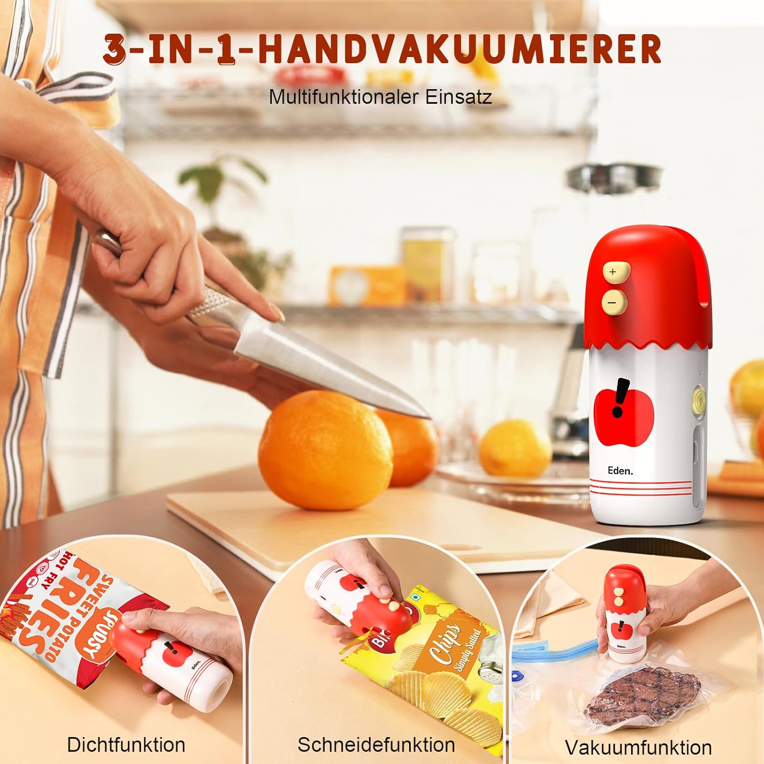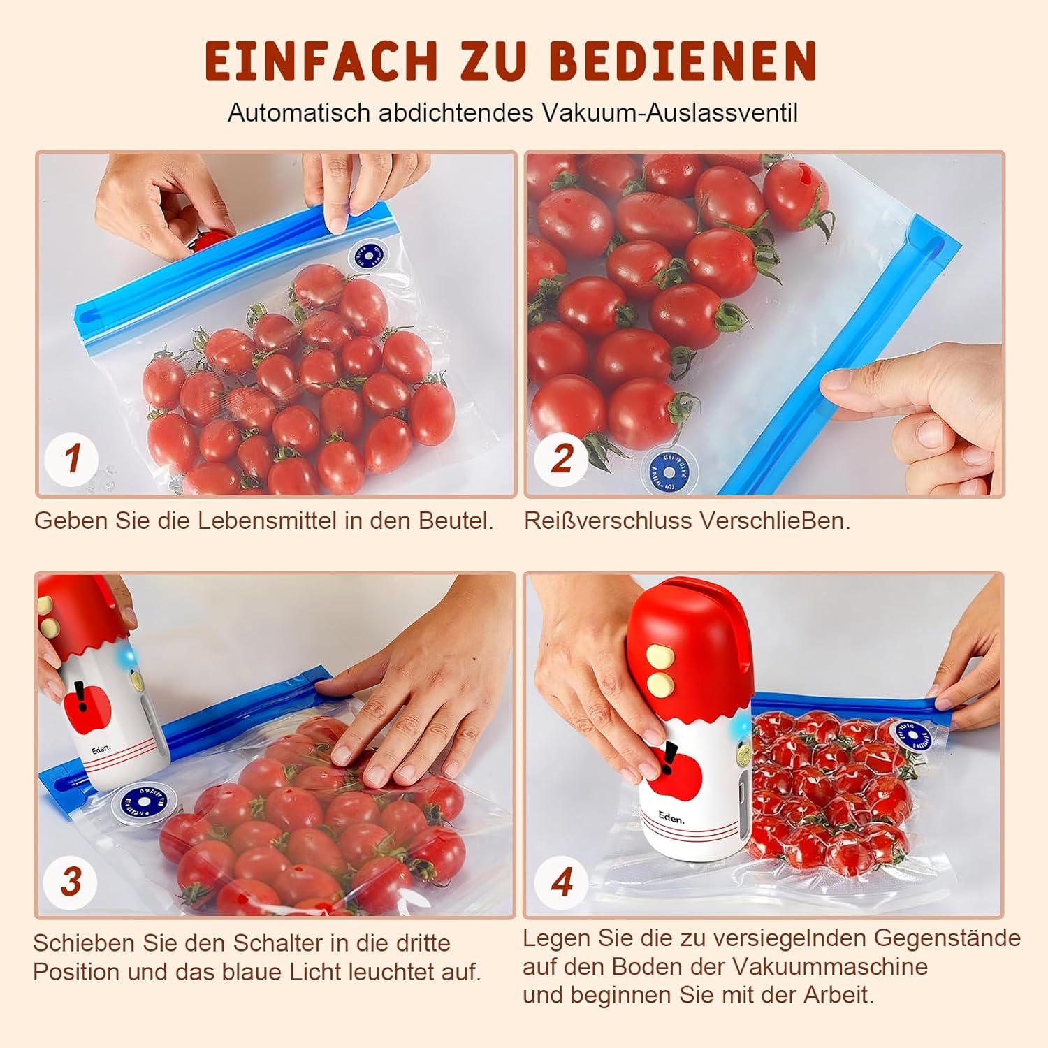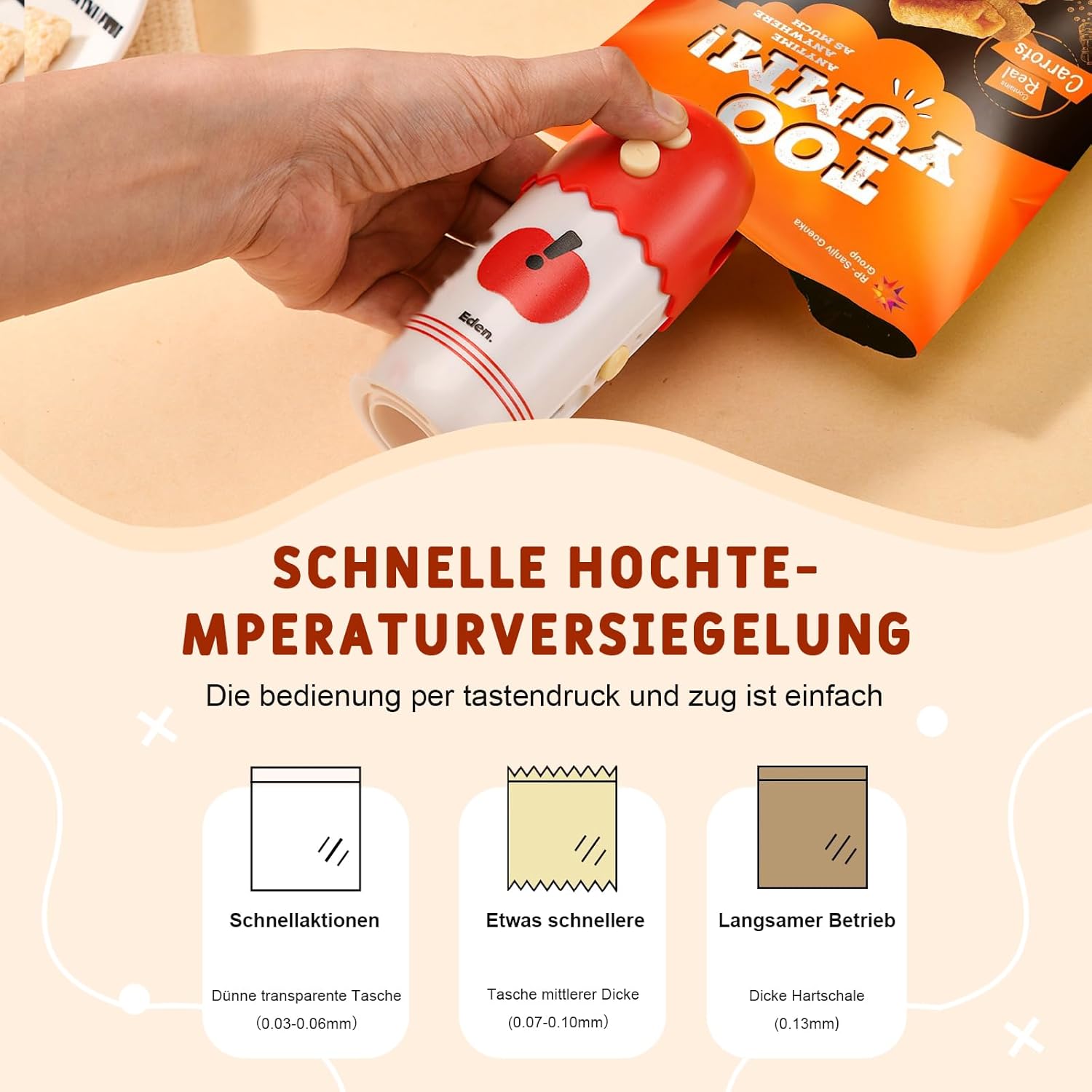 • Мощна функционалност: чрез натискане на бутона "+", нагревателният елемент незабавно достига работната температура на запечатване. В зависимост от дебелината на опаковъчния плик, можете да извършите бързо или бавно, равномерно запечатване чрез натискане на бутона "-". Силната всмукателна мощност позволява бързо вакуумиране на вакуумни пликове, вакуумиране на контейнери за храна и вакуумиране на кутии за обяд.