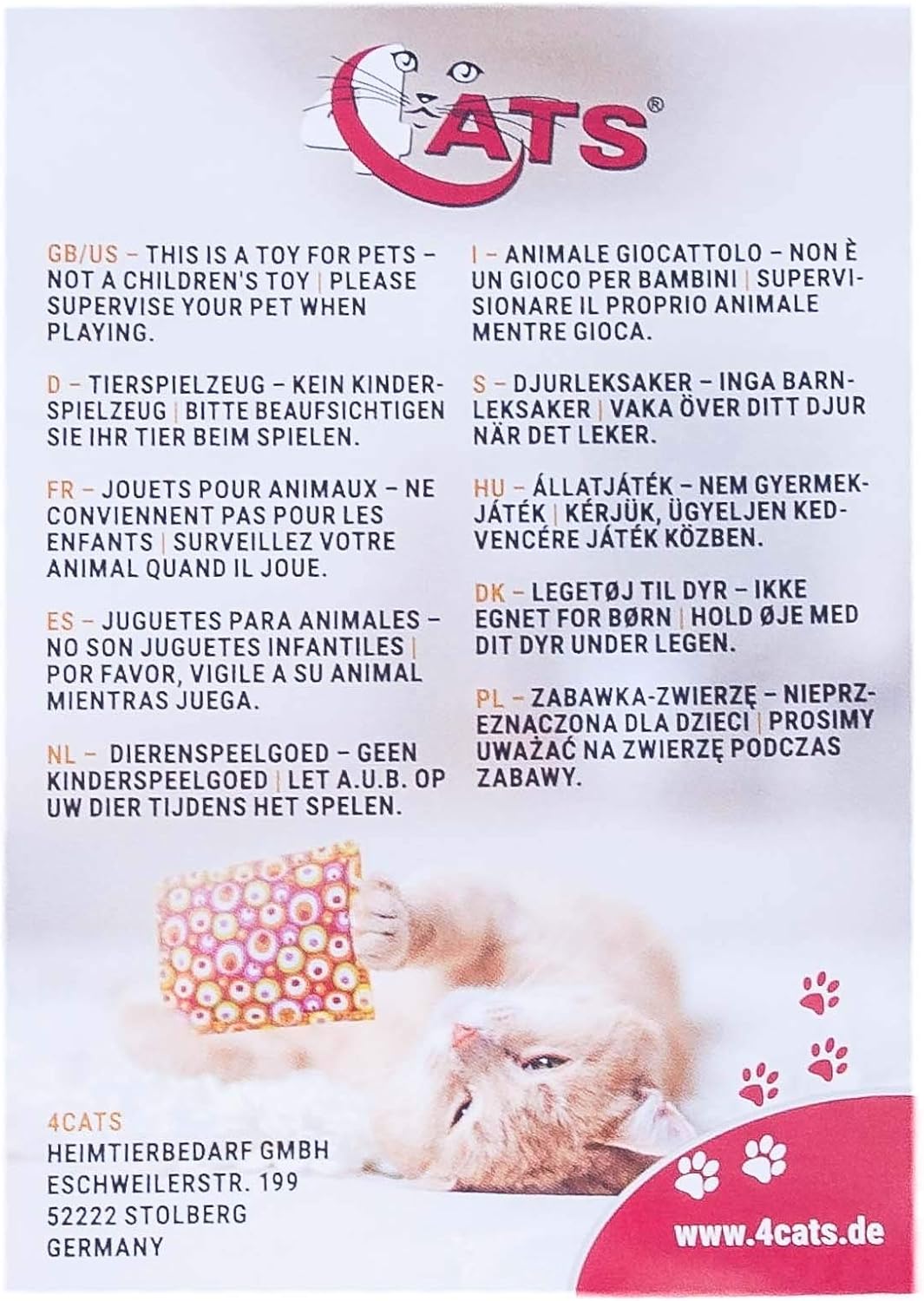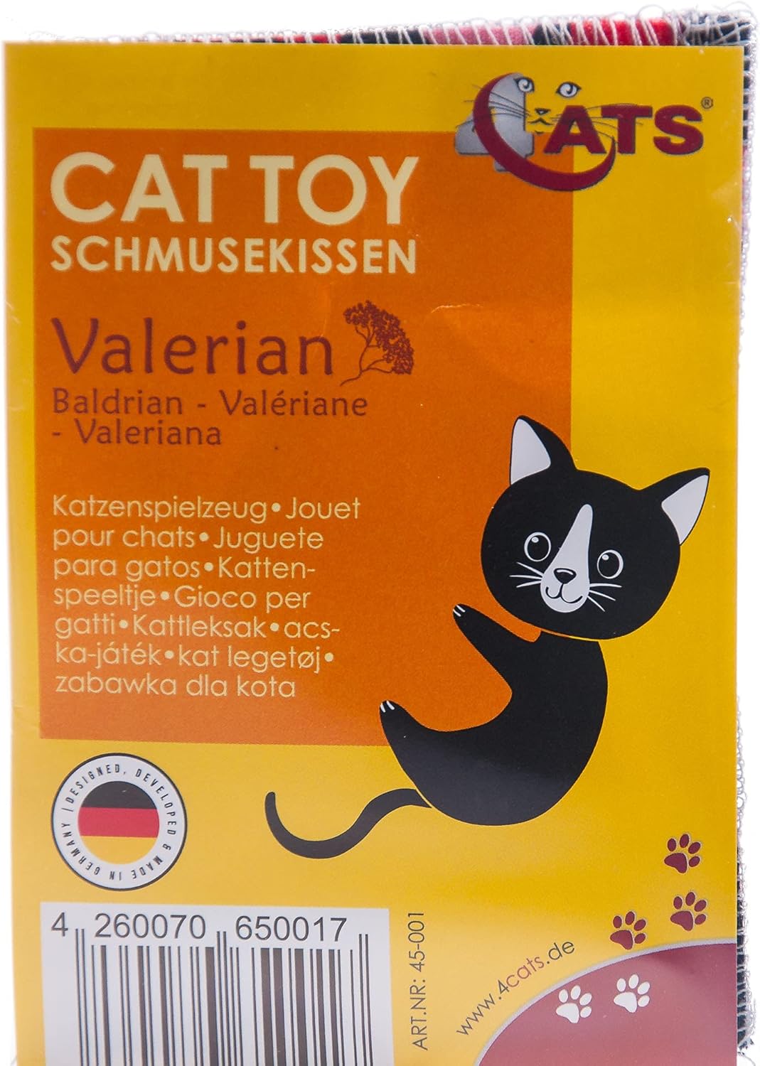 Само 1 възглавничка. 4 карата е името на производителя. Гушкавата възглавничка за котки ви кани на ароматна игра, както и на момент на нежност. Благодарение на пълнежа от памучна вата (руно), тя е особено мека и оставя свеж аромат благодарение на неустоимия валериан. Ръчно изработена в Германия и прясно опакована, благоденствие не само за четириногите приятели, но и за едно страхотно преживяване. Пълнена с валериана и памучна вата (руно). Размери: приблизително 7,5 x 10 см (2,9 x 3