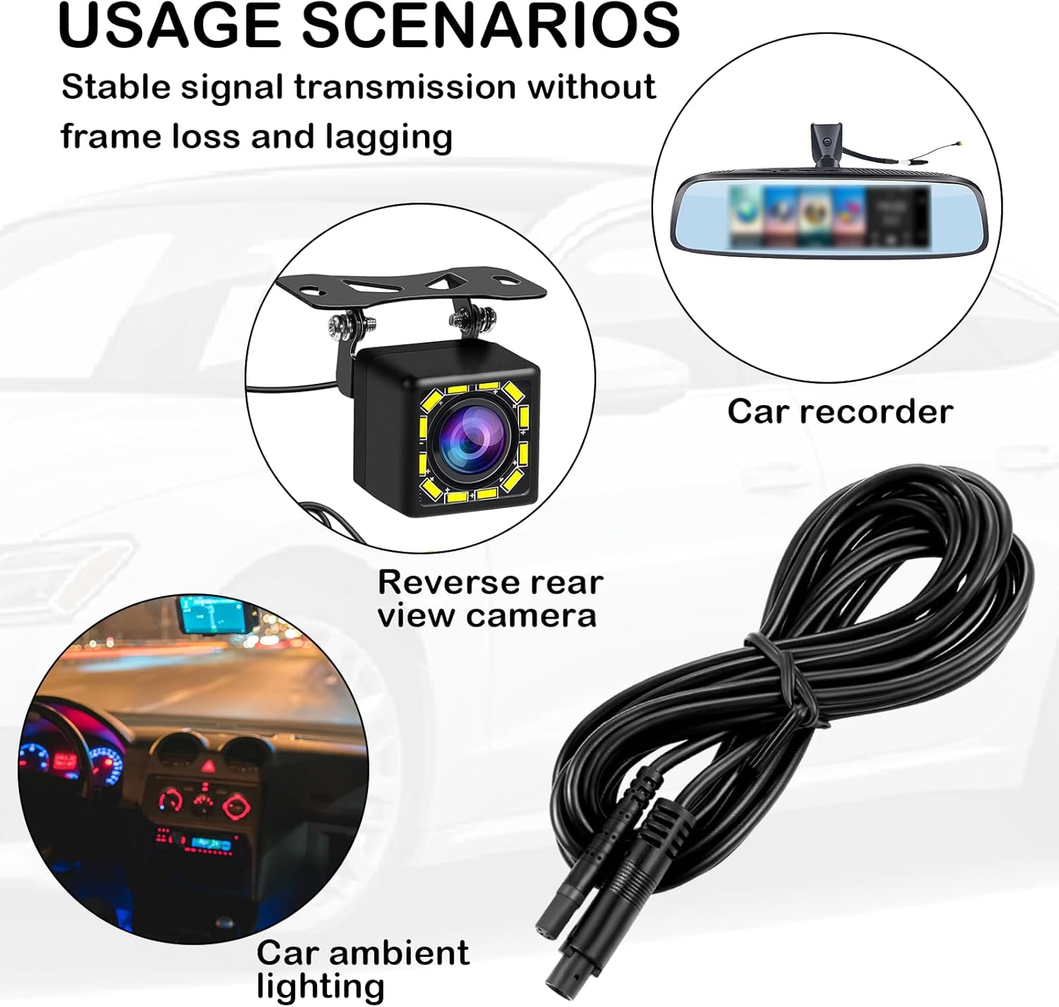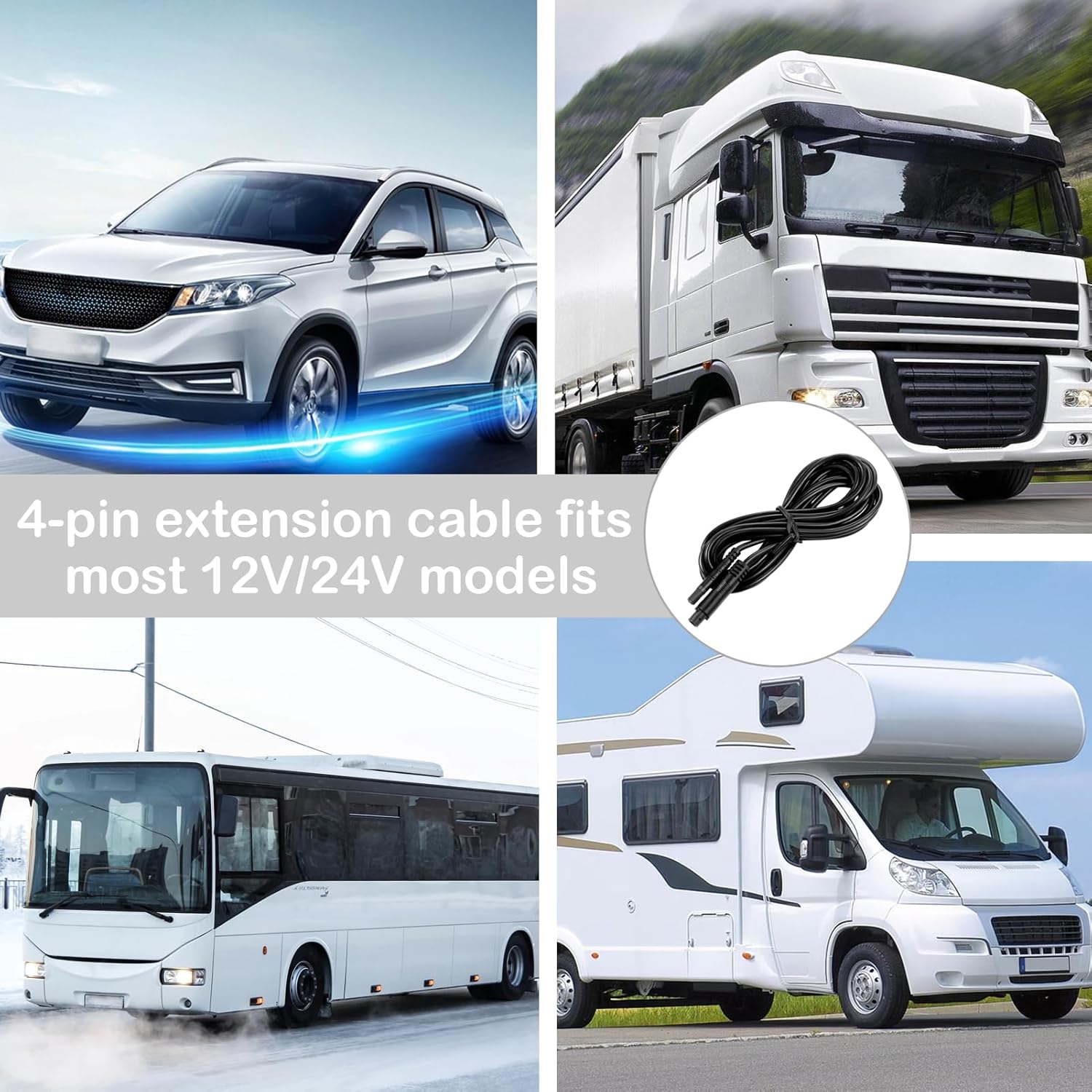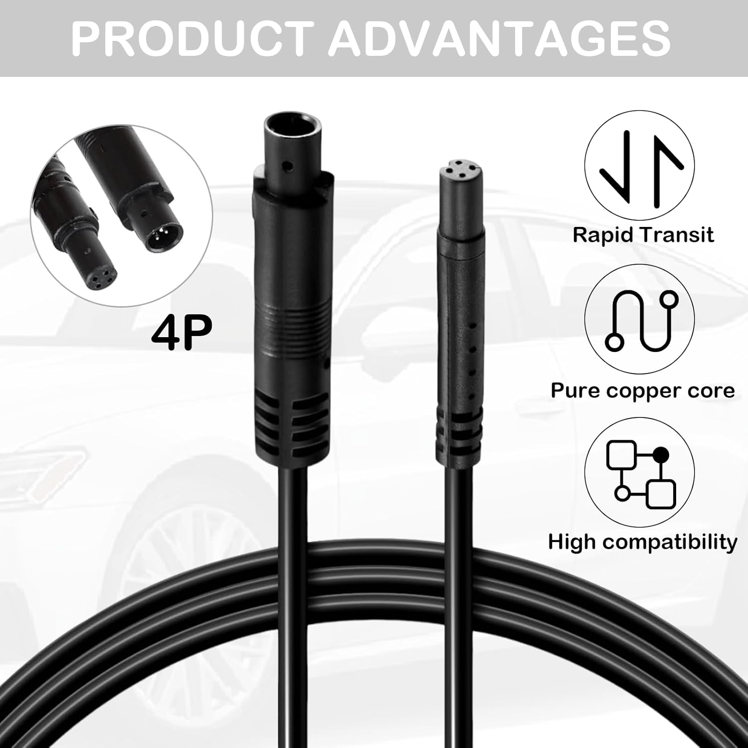 4-пиновият удължителен кабел за камера е подходящ за 12V/24V камиони/кемпери/ремаркета/автобуси. Дължината на кабела е 2,5 м/98,4 инча, което го прави чудесен аксесоар за камера за табло и камера за заден ход, достатъчен за вашите нужди.
