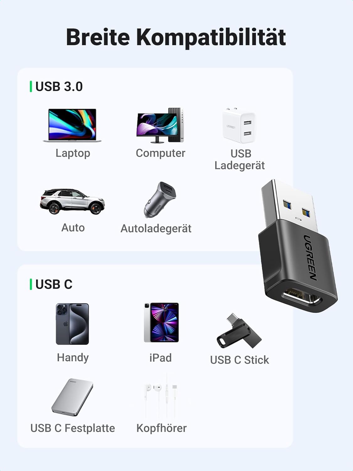 • Универсална съвместимост Адаптерът USB A към USB C може да преобразува USB A порта в USB-C порт, така че е съвместим с почти всички устройства с USB A и C порт, като например USB A зарядни устройства, лаптопи, USB-C слушалки, USB-C кабели, SSD дискове, USB-C стикове и други мобилни телефони с C порт, като например iPhone серия 16/15/14/13, Galaxy серия S24/S23/S22, Huawei Mate серия 60/50/40/30, iPad Pro 2022/2020/2018 и др.