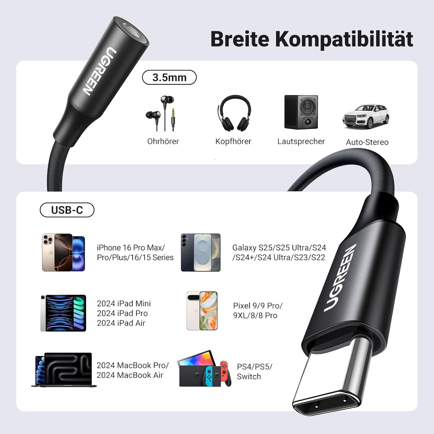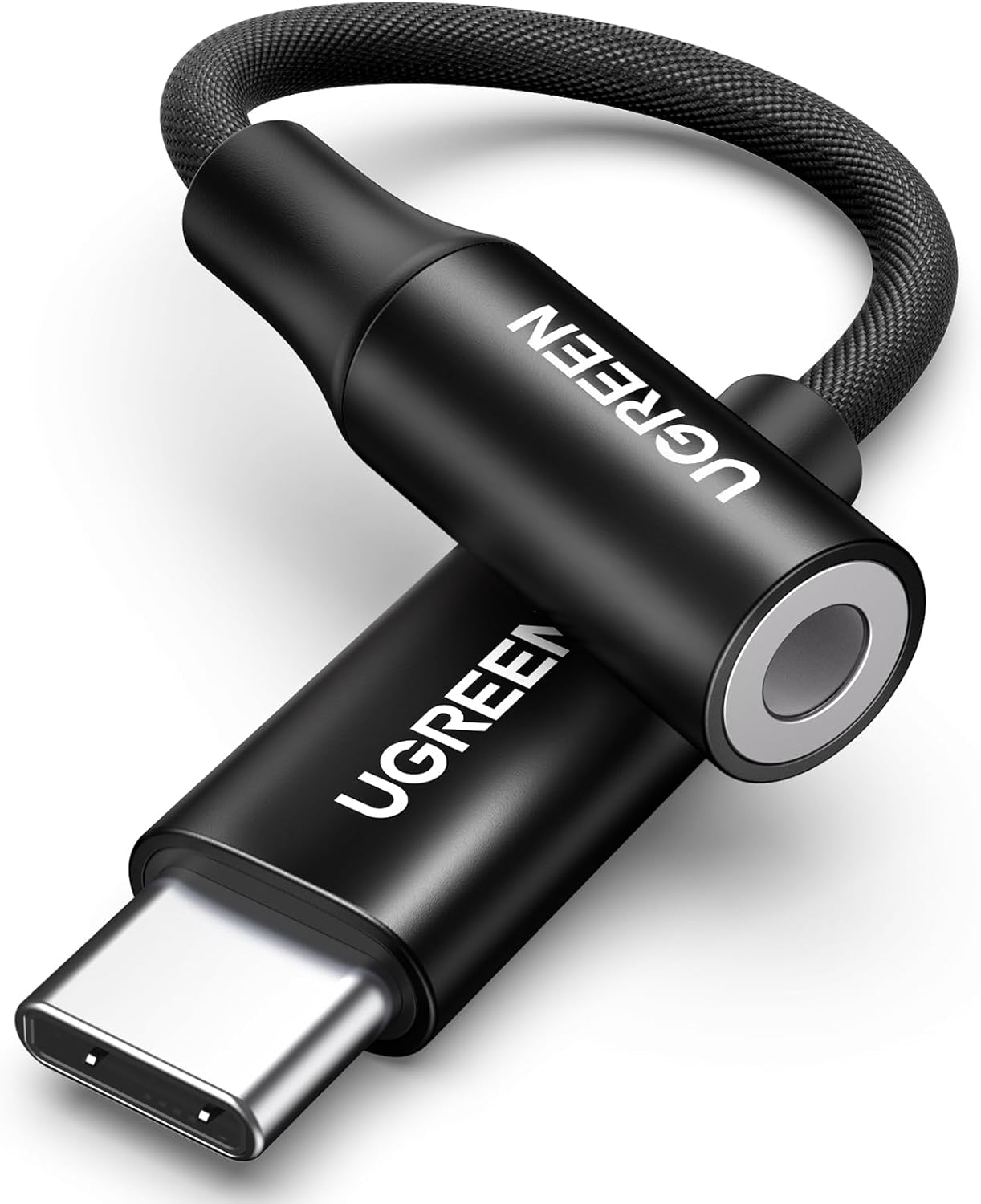 UGREEN USB C жак адаптер Aux USB C към 3.5 мм адаптер за слушалки с DAC чип, съвместим с iPhone 17/17 Air/17pro/17Pro Max, Galaxy S 25 Series, iPad, P60/50/40/Mate 30 (черен)