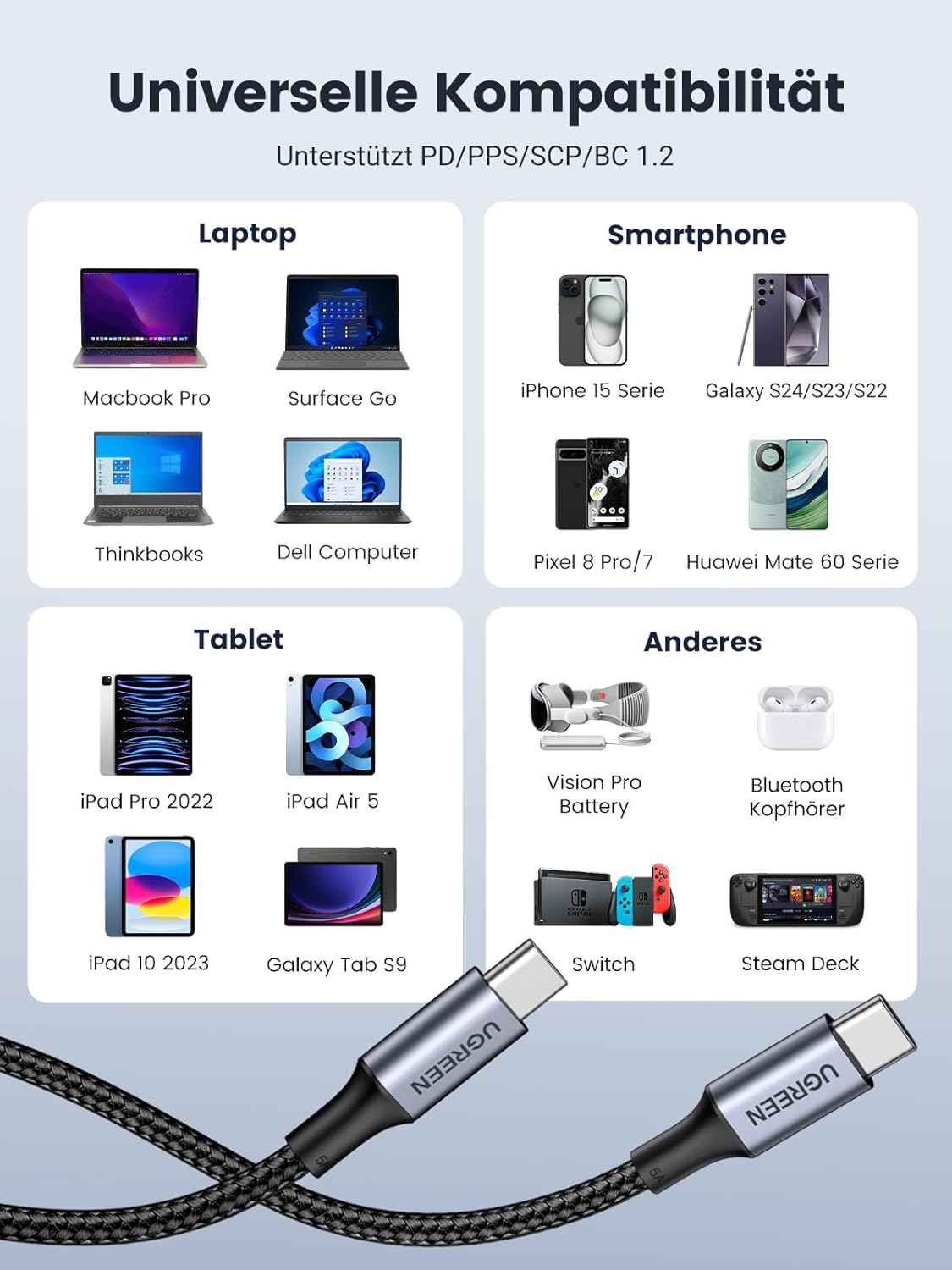 • Огромна съвместимост: USB C към USB C кабел за зареждане 100W е толкова мощен, че е подходящ за всички USB-C устройства, като например съвместим с iPhone 17, iPhone Air, iPhone 17 Pro, iPhone 16,15 Pro Max, M3 MacBook Pro/Air, Surface Pro 8, XPS13, ThinkPad, iPad Pro/Air 2024, iPad Mini 6/Air 5, Galaxy S24 Ultra, S24+, S24, A55 A35 A25 A15, Pixel 9/8/7, Steam Deck, Switch конзола, PS5 конзола, Watch Series 9/Ultra 2, AirPods Pro (2-ро поколение) и др.