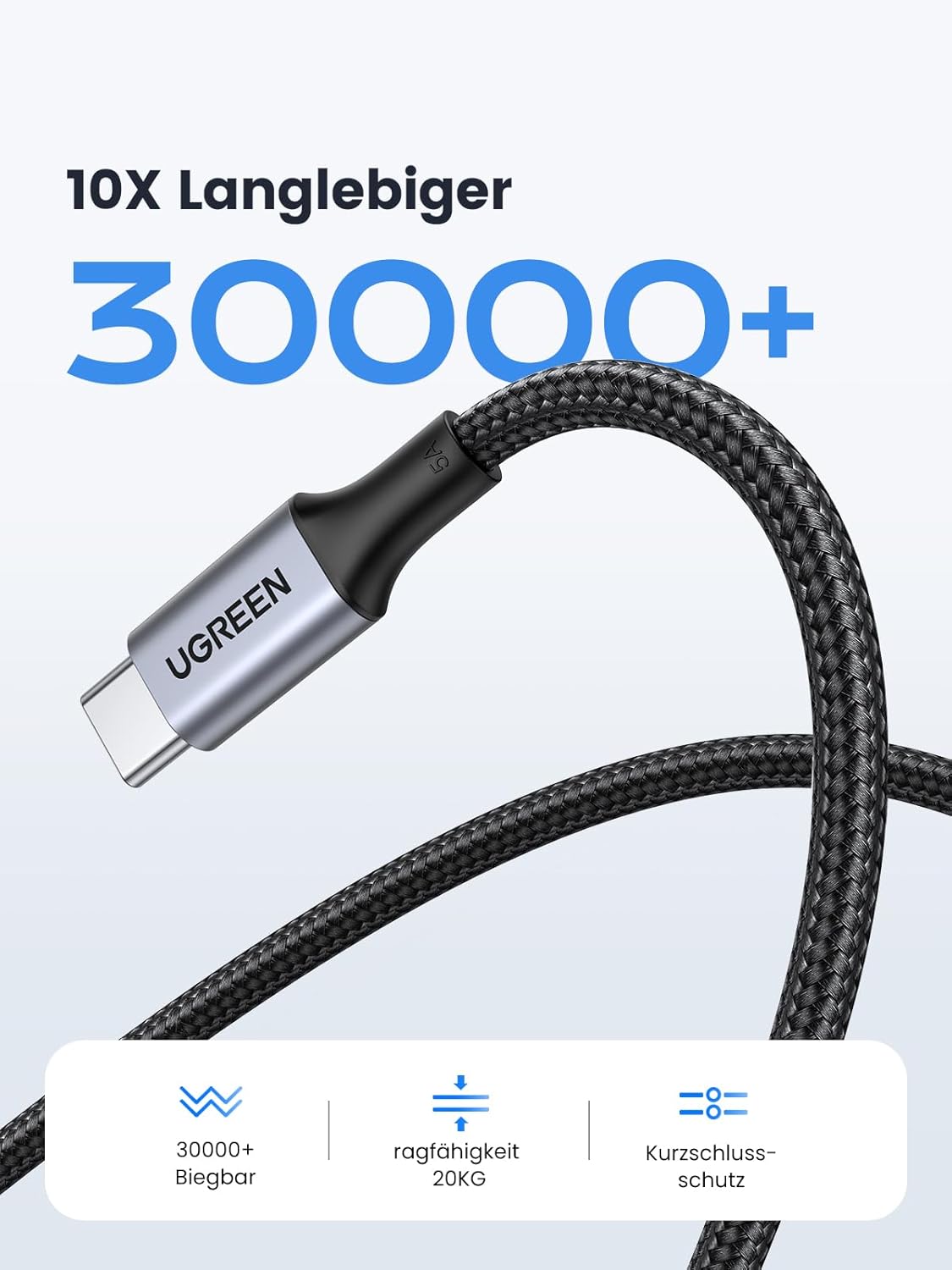 • Здрав и издръжлив: отвътре и отвън, благодарение на висококачествени материали като найлоново покритие, алуминиев корпус и защита от прегъване, зарядният кабел USB C 100W може да издържи на повече от 30 000 огъвания и 20 кг, като по този начин удължава експлоатационния си живот.