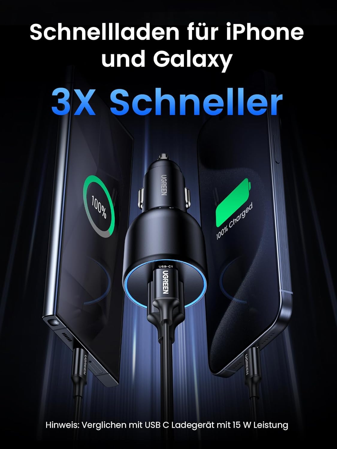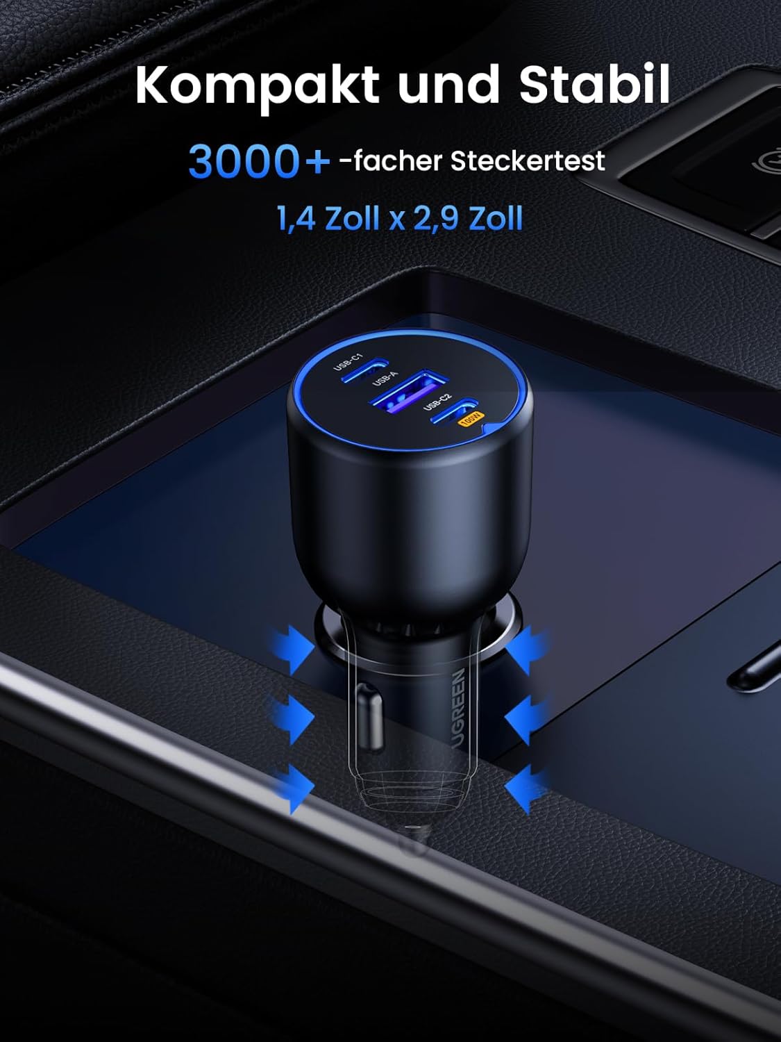 UGREEN Запалка за цигари USB C 130 W Автомобилни аксесоари Зарядно за кола 3-портово 12 V USB адаптер Бързо зарядно Зарядно за кола за MacBook Pro, iPhone 17/17Pro/17Pro Max/17 Air/16-12, iPad, Galaxy S25/S24