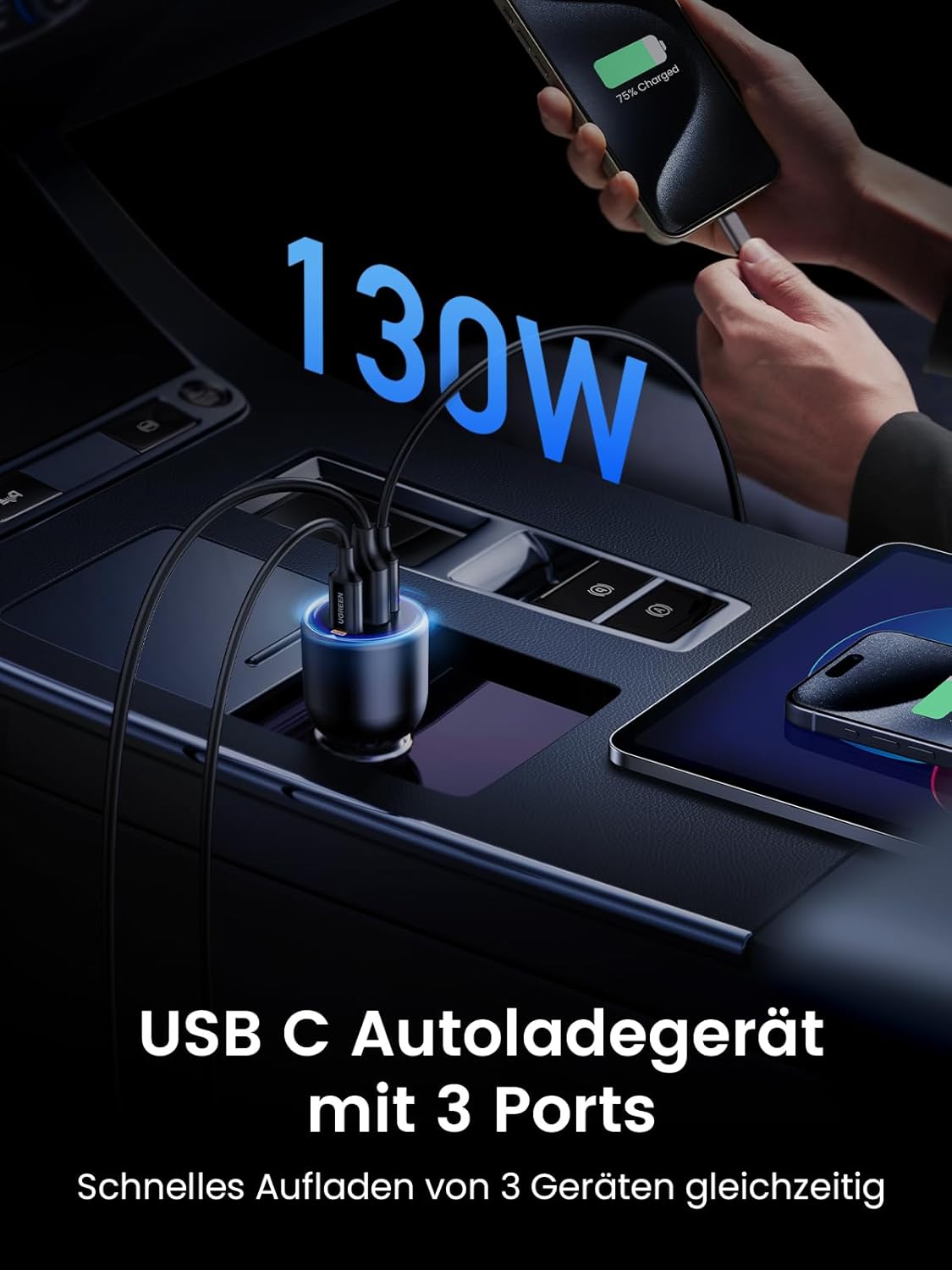 • 130W 3-портово зарядно за кола: това USB за запалка има функция за бързо зареждане PD+QC 3.0. С 2 x USB-C и 1 x USB-A порта, зарядното за кола USB C може да поддържа едновременно светкавично бързо зареждане на 3 устройства, като лаптопи, iPhone и таблети. То отговаря на всички ваши изисквания за бързо зареждане, незаменим аксесоар за интериора на автомобила за съвременните шофьори, идеалните автомобилни джаджи за вашия автомобил.