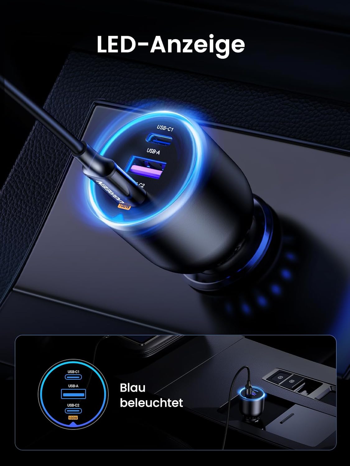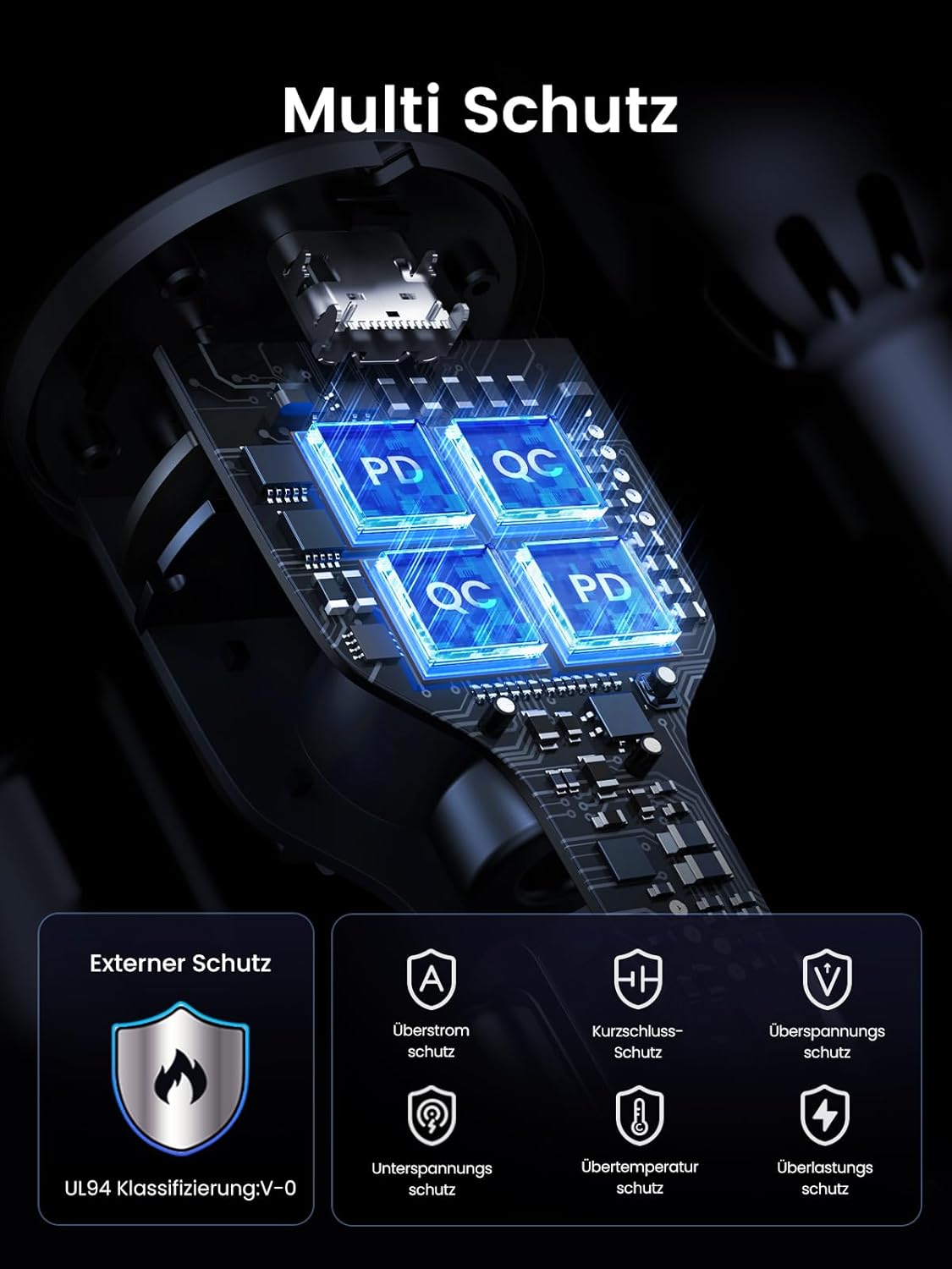 • Интелигентен чип за защита при зареждане: 130 W зарядното за кола за аксесоари с интелигентен чип разпределя тока разумно в реално време и предпазва устройството ви от късо съединение, пренапрежение и презареждане, без да съкращава експлоатационния му живот. Вентилационният дизайн на USB адаптера за запалка спомага за разсейване на топлината. Това бързо зарядно за запалка го прави надежден USB C вариант за кола за дълги пътувания и следователно е практичен аксесоар за интериора на автомобила.