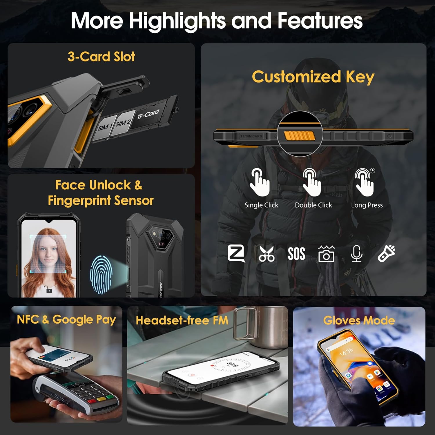 • 12 GB + 64 GB / 256 GB SD и най-новият Android 14: Ulefone Armor X13 е здрав мобилен телефон, оборудван с най-новата операционна система Android 14. Процесорът MediaTek Helio G36 Octa Core 2.2 GHz осигурява по-бърза обработка, по-малко забавяне и плавно гейминг изживяване. Разполага с до 12 GB RAM (6 GB RAM + 6 GB виртуална RAM) + 64 GB ROM, SD карта с капацитет до 256 GB, което прави изтеглянето и споделянето изключително лесно.