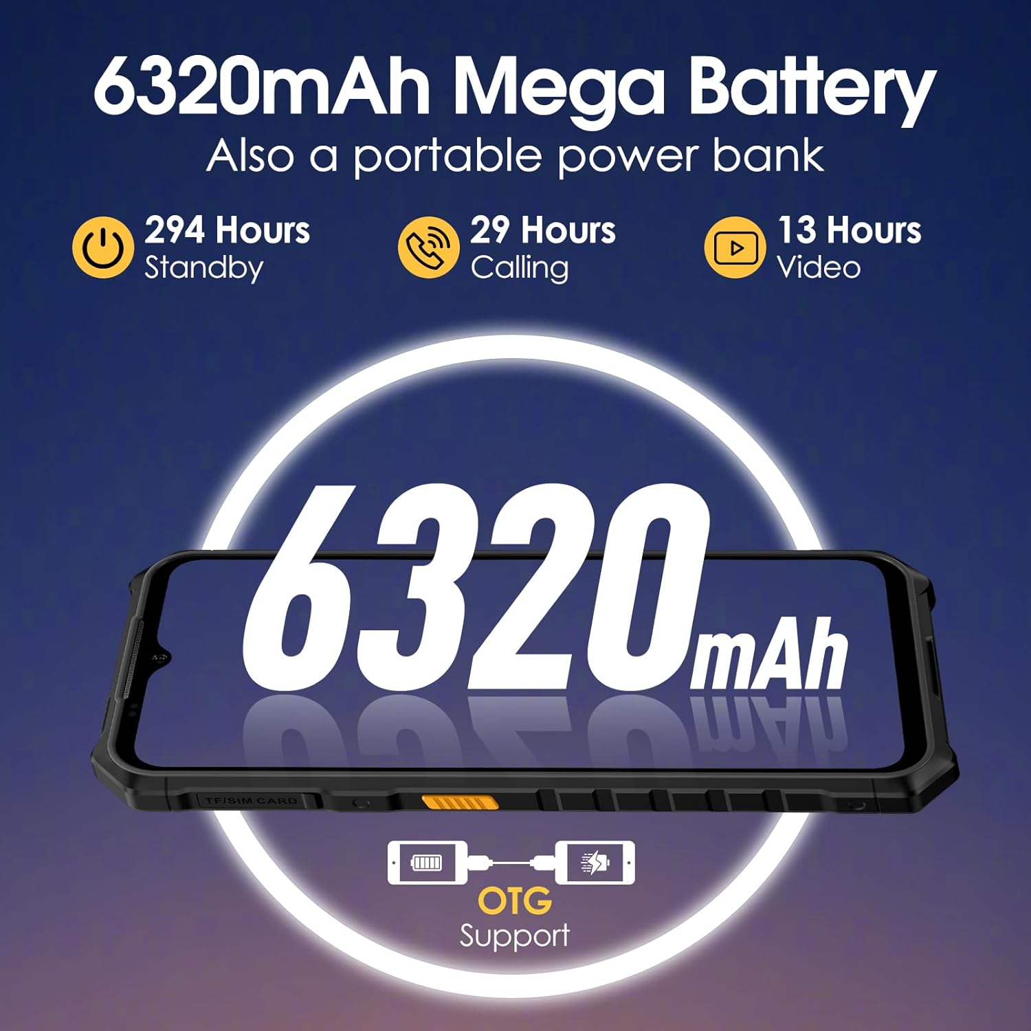 • 6320 mAh дълготрайна батерия + функция за преносимо захранване: Ulefone Armor X13, оборудван с батерия от 6320 mAh, може да осигури 294 часа време в режим на готовност, 29 часа време за разговори, 30 часа време за слушане на музика и 9 часа време за видео, 1 ден употреба само с 1 зареждане. Поддържа OTG функция, можете да го използвате като преносимо захранване за зареждане на други телефони, часовници и слушалки. Идеален за бизнес пътуване или друга употреба на открито.