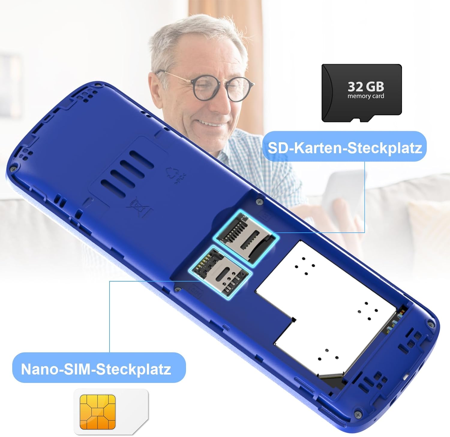 • Здрав 4G мобилен телефон за възрастни хора: с мощна батерия от 1400 mAh, той предлага до 300 минути време за разговори или 300-360 часа работа в режим на готовност - идеален за възрастни хора. Паметта е разширяема (до 32 GB).