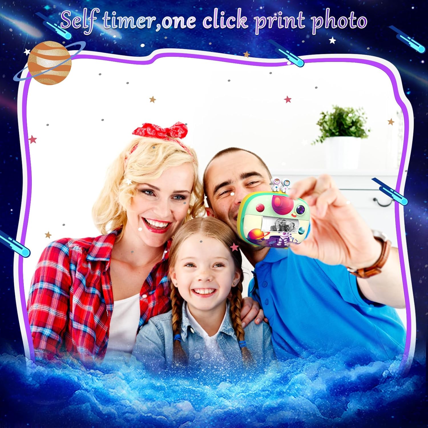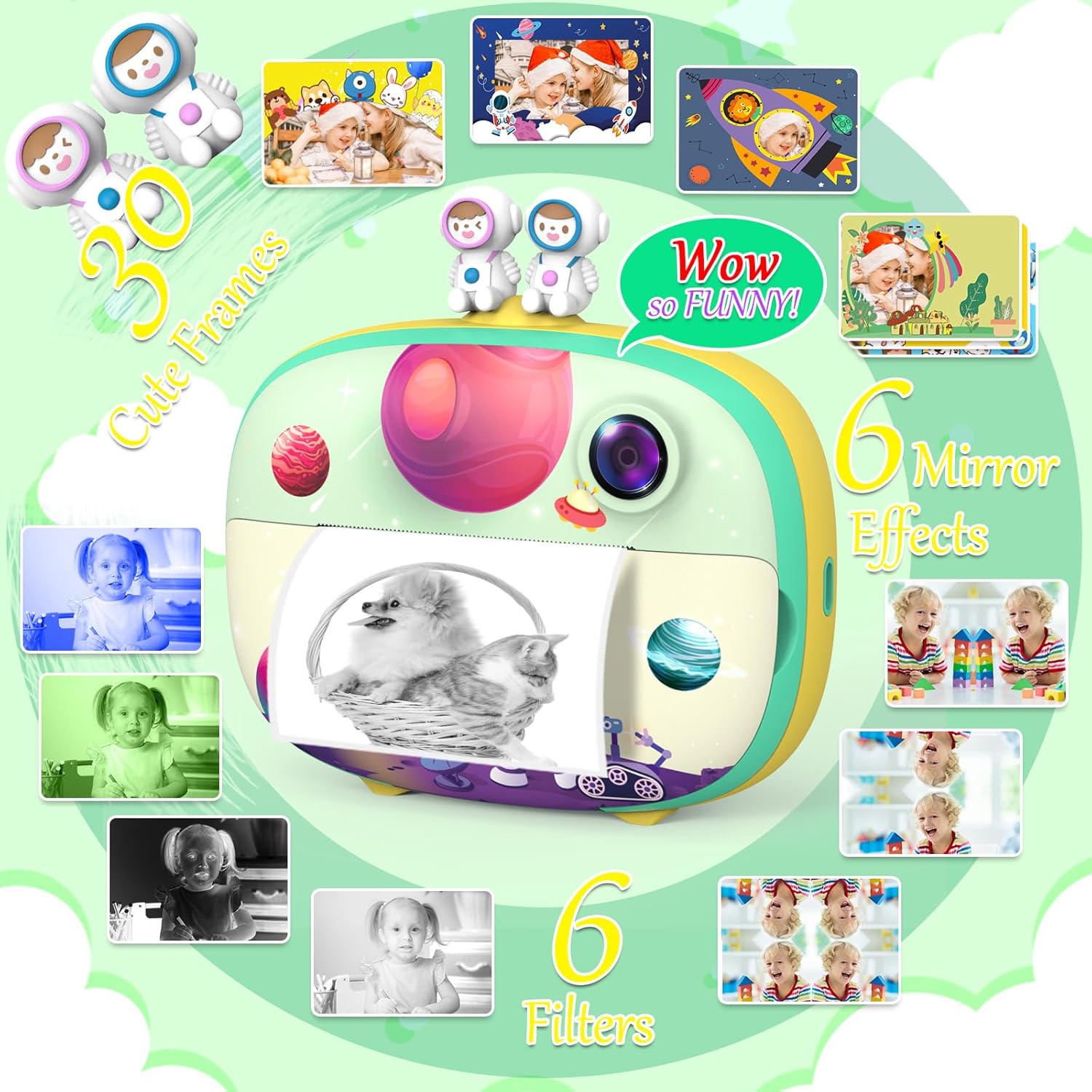 • Най-добрият подарък за фотоапарат за детското космическо въображение: с този детски фотоапарат, който е едновременно дигитален фотоапарат и фотоапарат за моментални снимки за деца. В допълнение, новостта на дизайна с двете кукли е уникално преживяване за децата, което събужда желанието им да изследват света. Децата могат да правят цветни изображения и 1080p HD видеоклипове, както и да отпечатват черно-бели снимки. Перфектен подарък за рожден ден/Коледа/още един ден за деца на възраст 3-12 години.