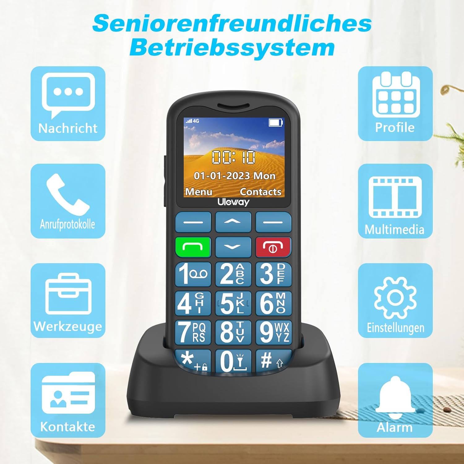 Мобилен телефон за възрастни хора без договор: Има големи бутони за лесно набиране, голям шрифт за по-добра видимост и мощен високоговорител за регулиране на силата на звука.