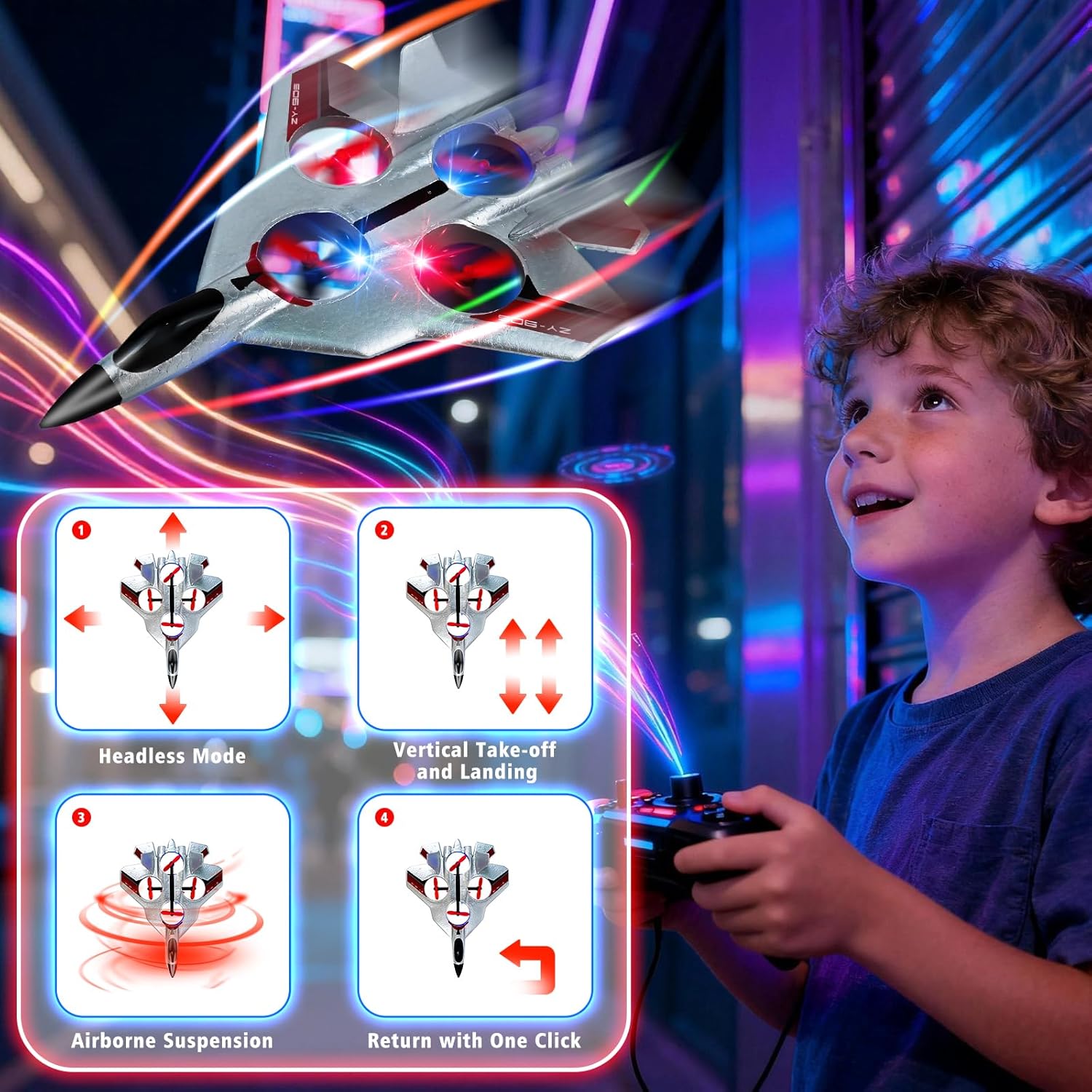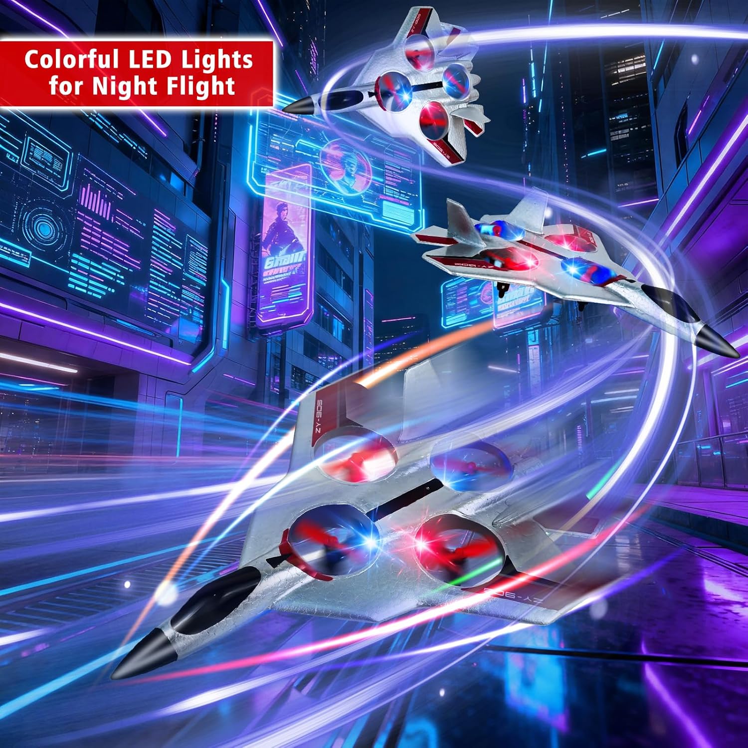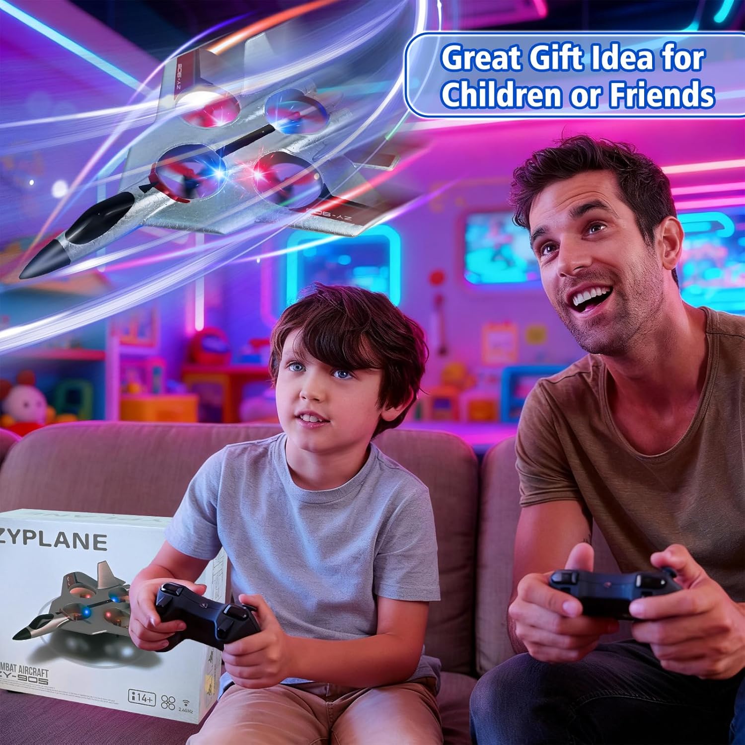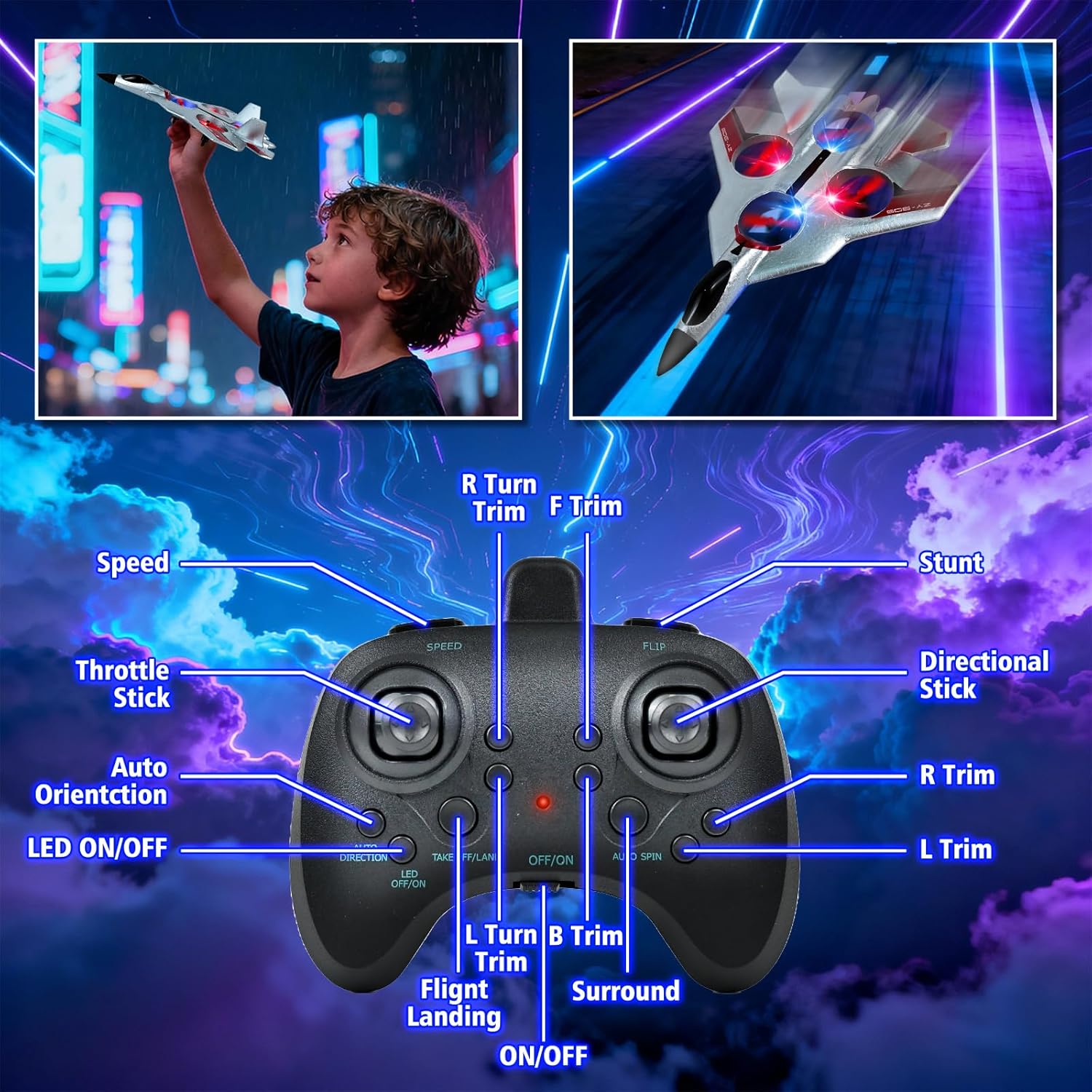 • Лесен полет: Специално проектиран за деца, RC самолетът предлага разнообразие от акробатични функции, като кръгов полет, обръщане на 360°, завъртане на колата, както и основни маневри като полет напред, назад и страничен полет. Оборудван с цветни светлини, той предлага върховно забавление при летене както денем, така и нощем.