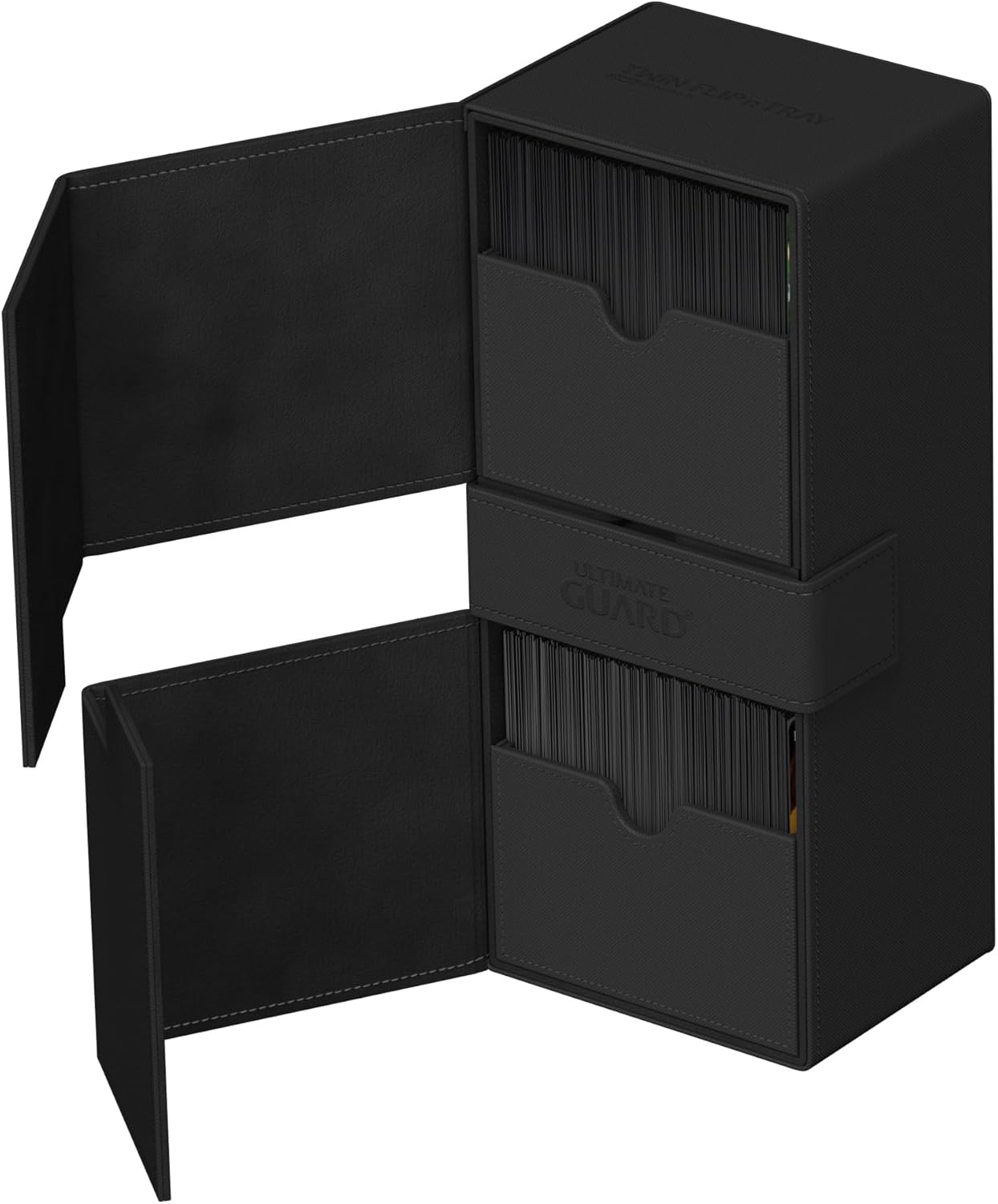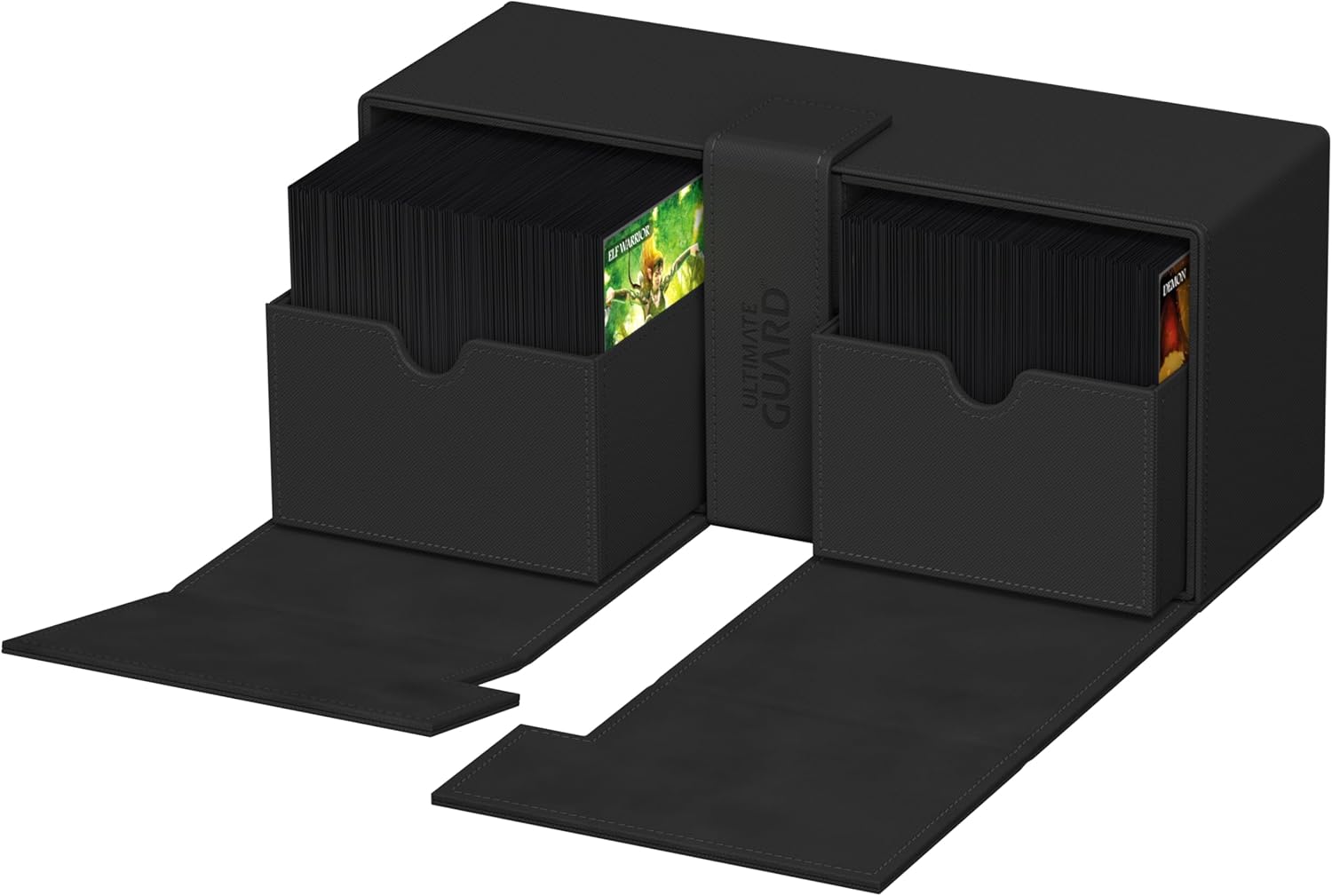 Двойно място за големи тестета! Изпитаният Twin Flip'n'Tray – сега в нов размер! Ексклузивният Twin Flip'n'Tray 266+ за 2022 г. е специално проектиран за тестета Commander / EDH ** и предлага място за всички видове тестета, с двоен или единичен ръкав, както и за вашите жетони и други допълнителни карти. Двоен дом за големи тестета карти: Twin Flip'n'Tray 266+. Характеристики: - Проектиран за до 266 (с двоен ръкав) или 315+ (с единичен ръкав) карти със стандартен размер в Ultimate Guard Sleeves* - Модулен дизайн за комбиниране с продукти на Ultimate Guard - Подвижни отделения за карти и аксесоари - Независим достъп до всяко отделение - Издръжлив материал Xenoskin - Обикновен дизайн с висококачествена микрофибърна вътрешност - Силно магнитно закопчаване Приблизителни размери: 114 x 90 x 250 мм * Проектиран за Ultimate Guard ръкави. Ръководствата за карти от други производители могат да повлияят на капацитета и/или съвместимостта. **Magic: The Gathering™ и „Magic: The Gathering Commander™“ са регистрирани търговски марки на Wizards of the Coast, Inc.