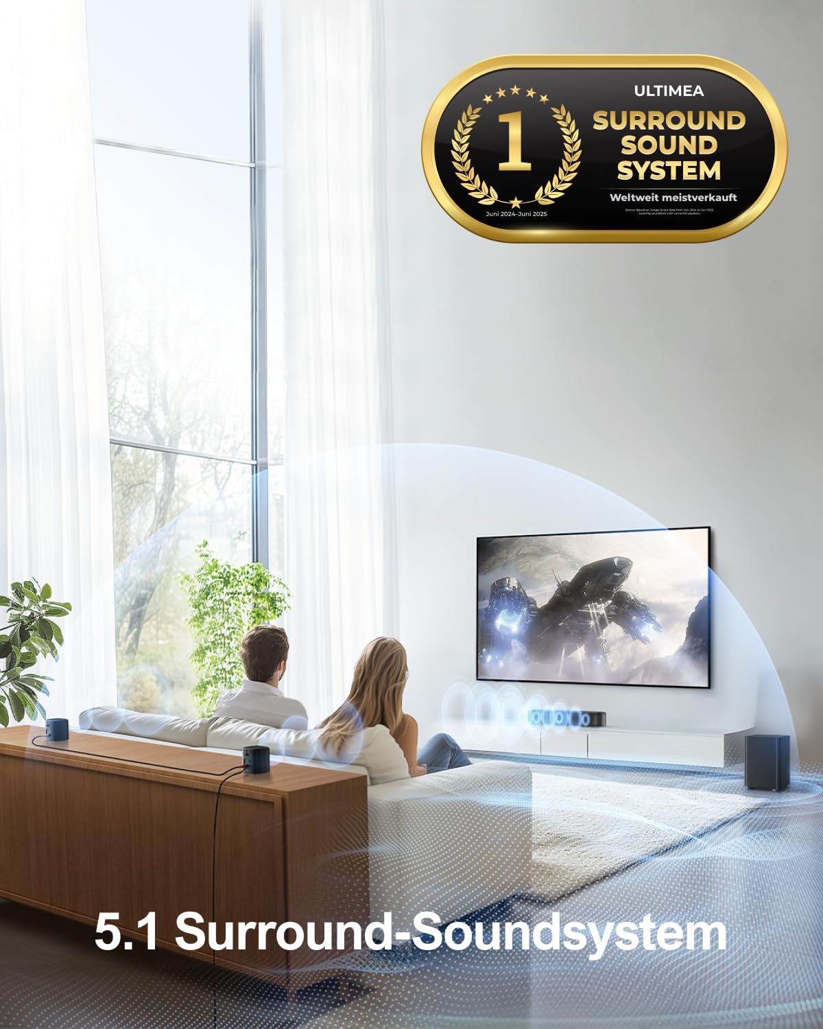 • 5.1-канална система за съраунд звук за телевизор: С три основни звукови канала, саундбарът Ultimea за смарт телевизори осигурява кристално ясни диалози. Подкрепен от два съраунд високоговорителя и субуфер, той създава впечатляващ съраунд звук и дълбок, мощен бас. Забележка: Препоръчва се за помещения ≤20 м².
