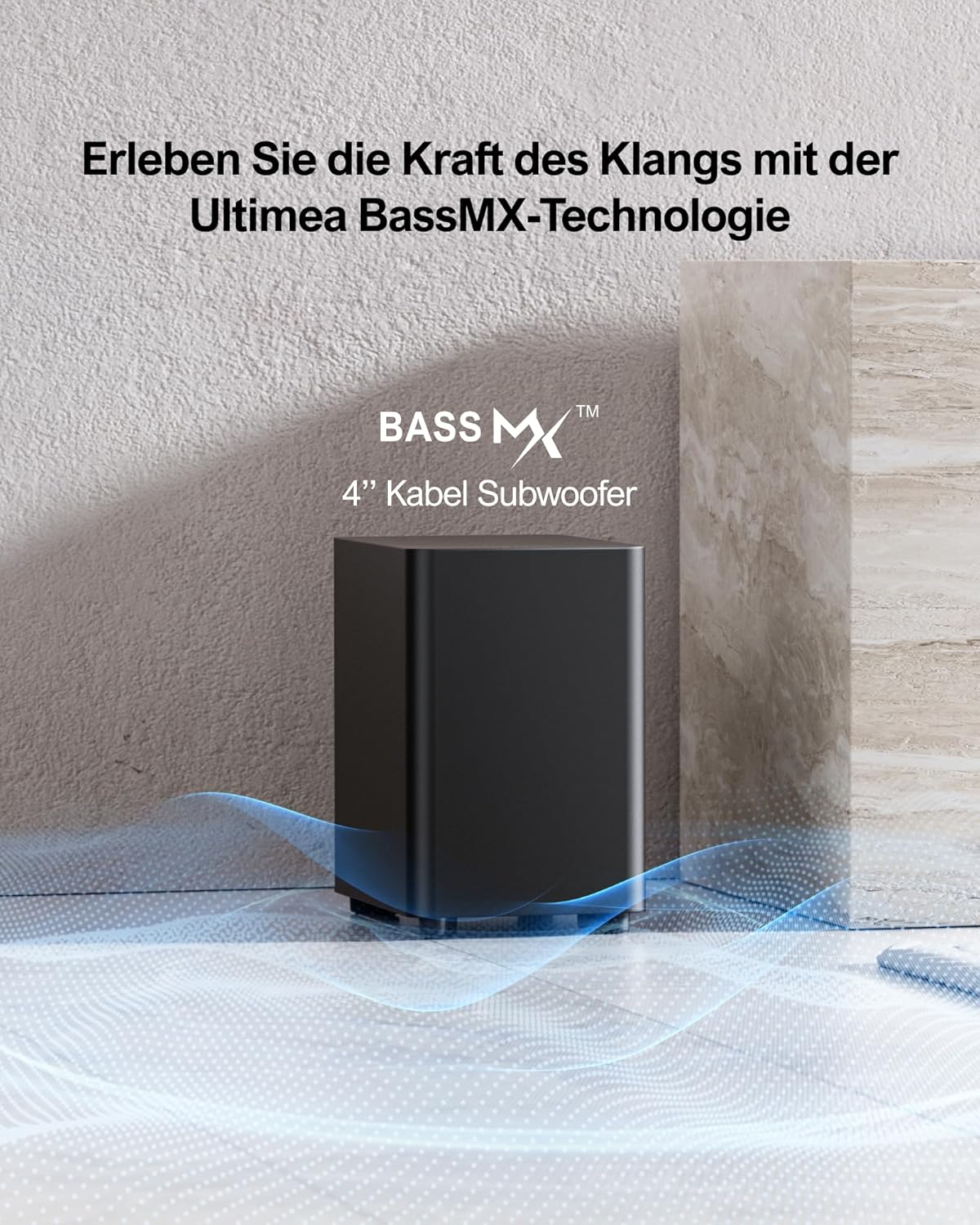 • 4-инчов кабелен субуфер с технология BassMX: Саундбарът за телевизор Ultimea TV разполага с кабелен 4-инчов субуфер с технология BassMX за подобрен басов звук. Оптимизираният му дизайн осигурява дълбок, резонансен бас и усилва екшън сцените и експлозиите с мощно въздействие.