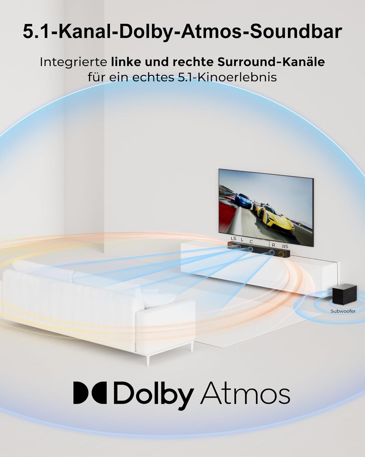 • Опростена 5.1-канална Dolby Atmos настройка: Изживейте завладяващ 4D звук с истински Dolby Atmos и 5.1-канално аудио. Пет вградени високоговорителя, включително два странични излъчващи драйвера, създават широкообхватно съраунд изживяване без никакви задни високоговорители. Прецизната DSP обработка осигурява латентност по-малка от 0,5 ms за плавен звук, подобен на този в киносалон. Настройката отнема по-малко от минута, перфектен избор за вашия саундбар за домашно кино. Забележка: Не е съвместимо с DTS.