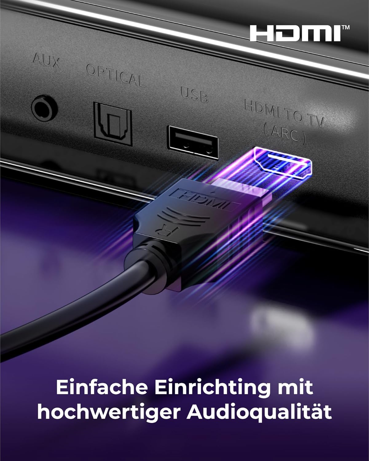 • Безпроблемна съвместимост с връзка - Саундбарът има двойни опции за кабелна и безжична връзка, включително ARC, оптичен, AUX и USB портове (всички кабели са включени). Технологията Bluetooth 5.3 осигурява по-високи скорости и обхват до 15 метра.