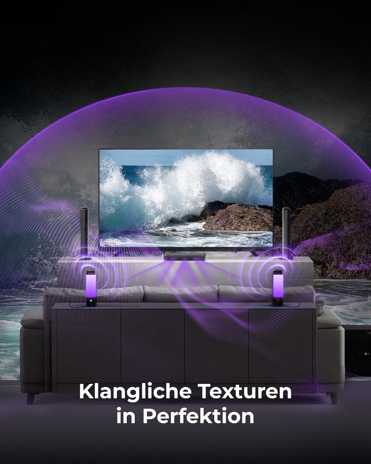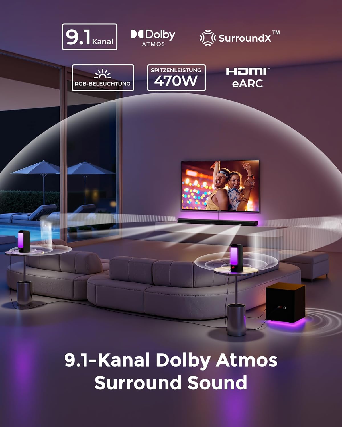 ULTIMEA 9.1 саундбар за телевизори, 470 W съраунд озвучителна система с 2 задни високоговорителя, отделяема Dolby Sound система с 6,5-инчов субуфер, RGB саундбар за телевизор, HDMI/Opt/AUX/BT, Apollo S90